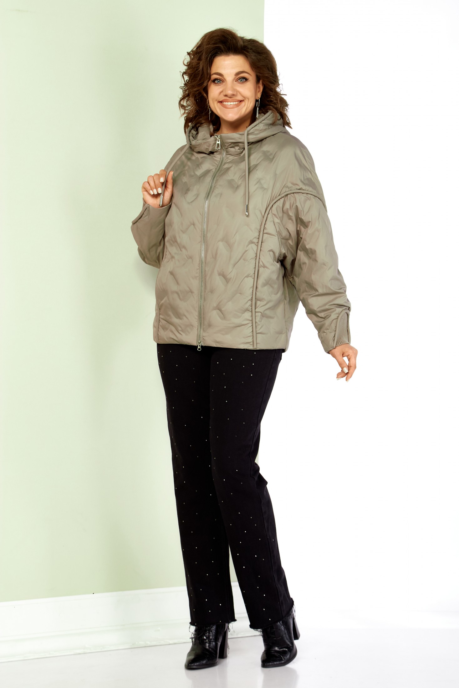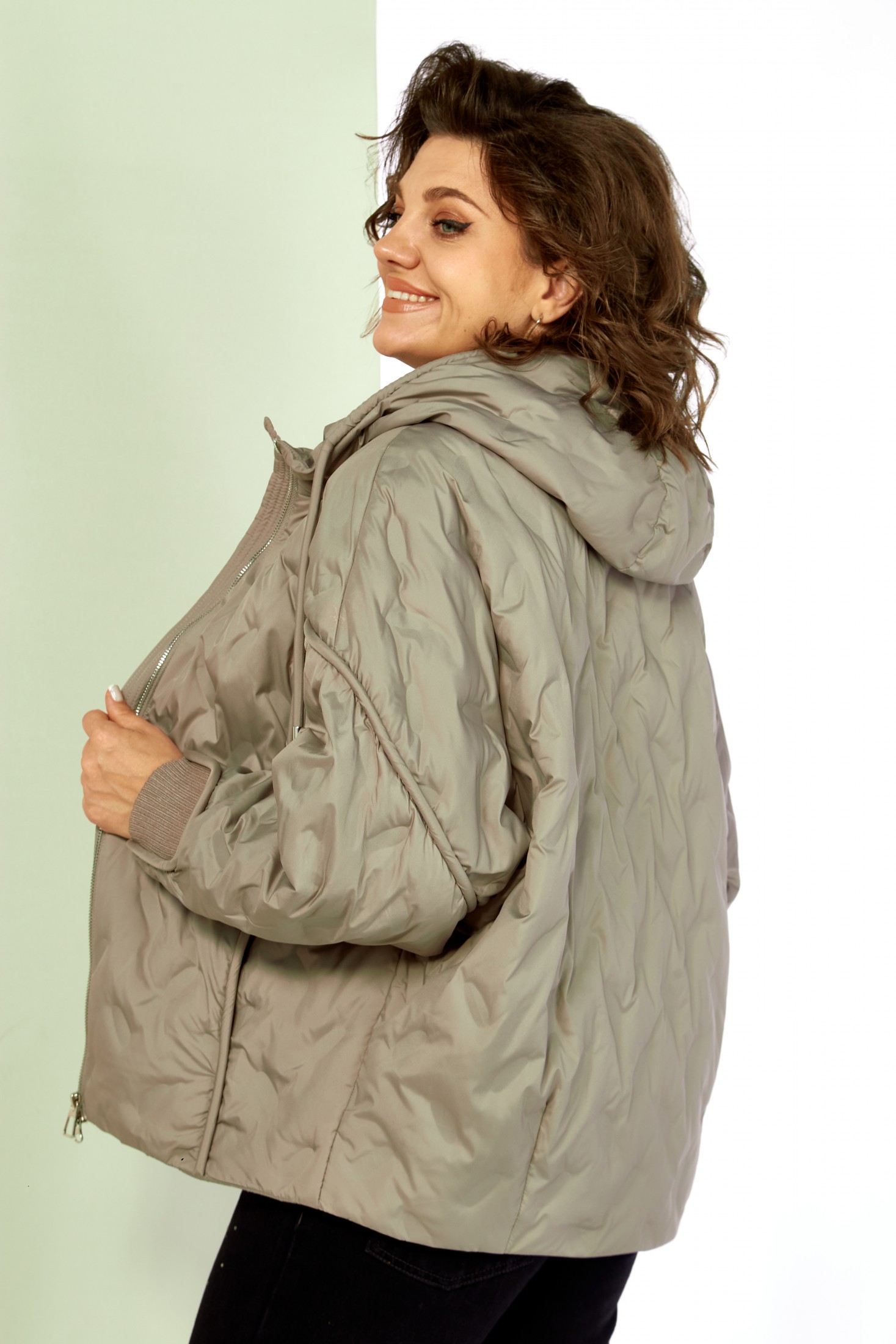 Застежка центральная на молнии. Рукав реглан. В передней части кант плавно переходящий на рукав, в котором расположены прорезные карманы на кнопках. Низ рукавов с трикотажной вставкой в тон основной ткани. Капюшон не съемный, регулируется декоративным шнуром. Спинка цельнокроеная, по низу две вытачки, для более плотного прилегания к фигуре. С внутренней стороны куртки имеется внутренний карман. Низ с фигурной линией, что придает изделию оригинальный вид. А также регулируемая кулиса. За счет свободного кроя изделие подойдет на любую комплектацию и фигуру.