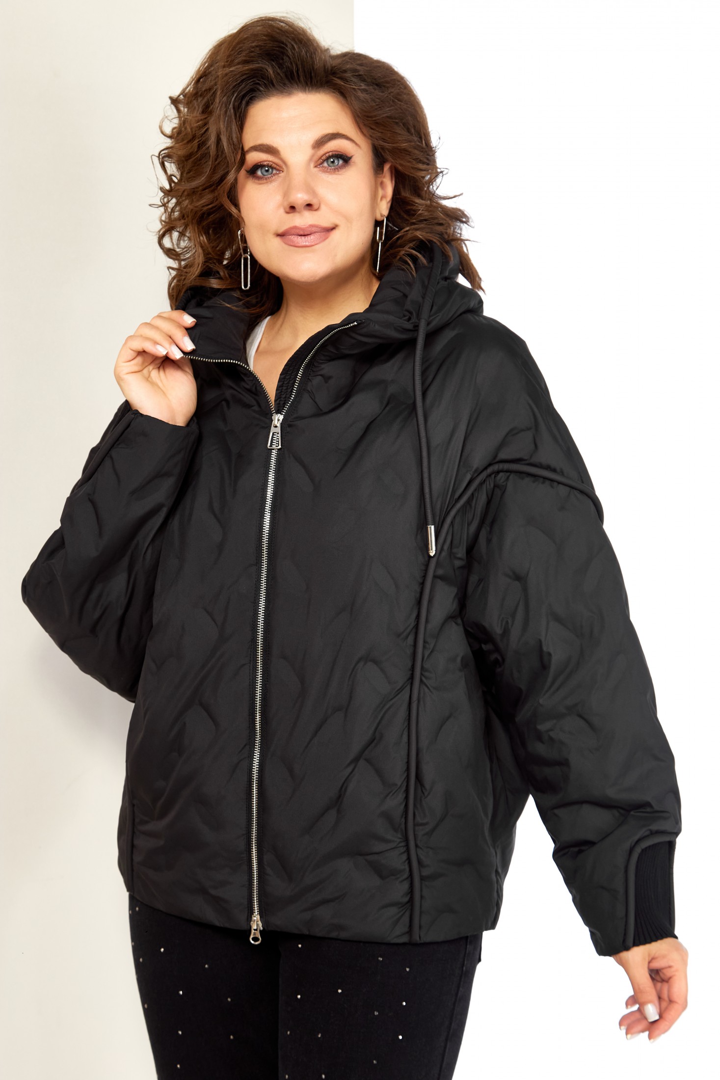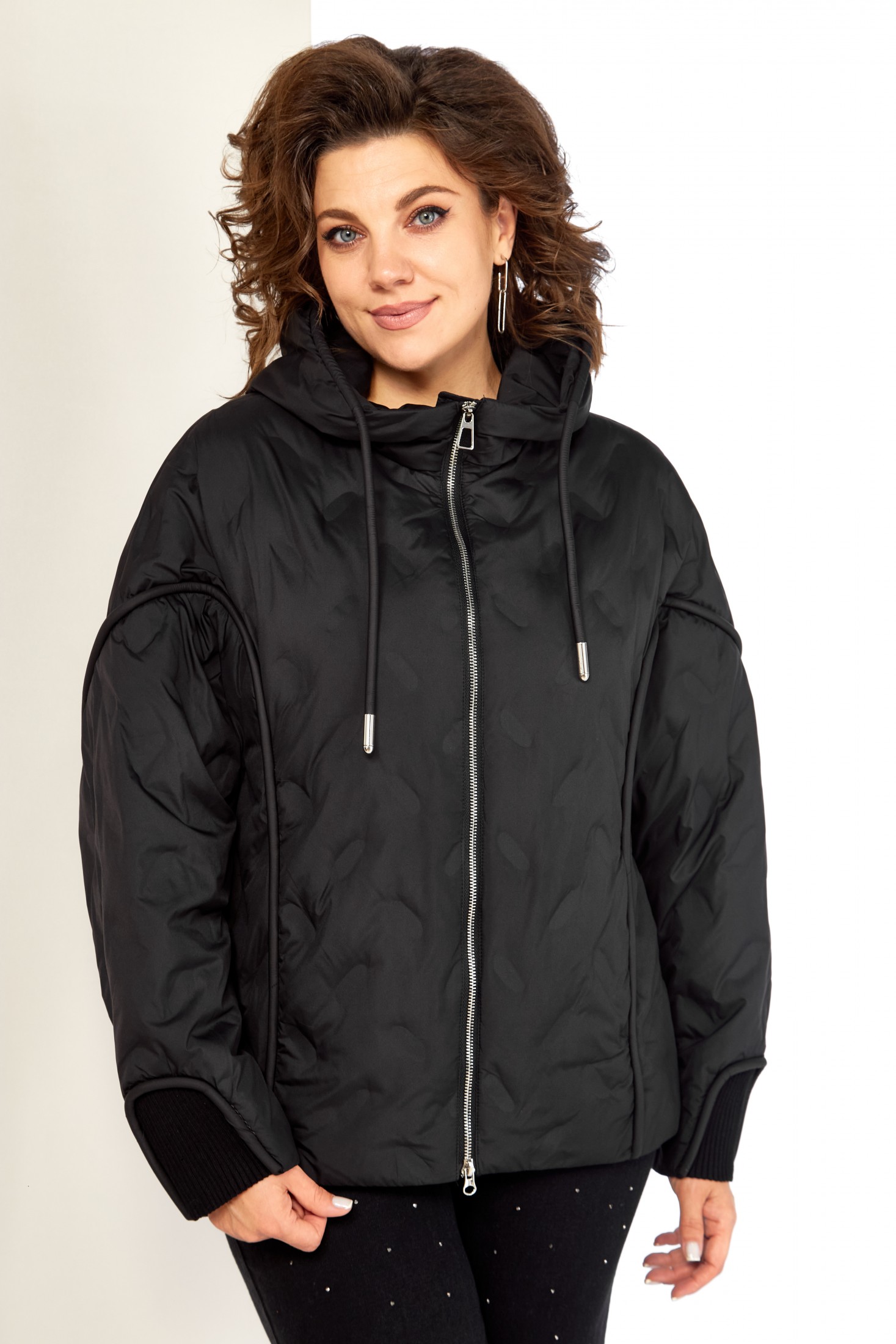 Застежка центральная на молнии. Рукав реглан. В передней части кант плавно переходящий на рукав, в котором расположены прорезные карманы на кнопках. Низ рукавов с трикотажной вставкой в тон основной ткани. Капюшон не съемный, регулируется декоративным шнуром. Спинка цельнокроеная, по низу две вытачки, для более плотного прилегания к фигуре. С внутренней стороны куртки имеется внутренний карман. Низ с фигурной линией, что придает изделию оригинальный вид. А также регулируемая кулиса. За счет свободного кроя изделие подойдет на любую комплектацию и фигуру.