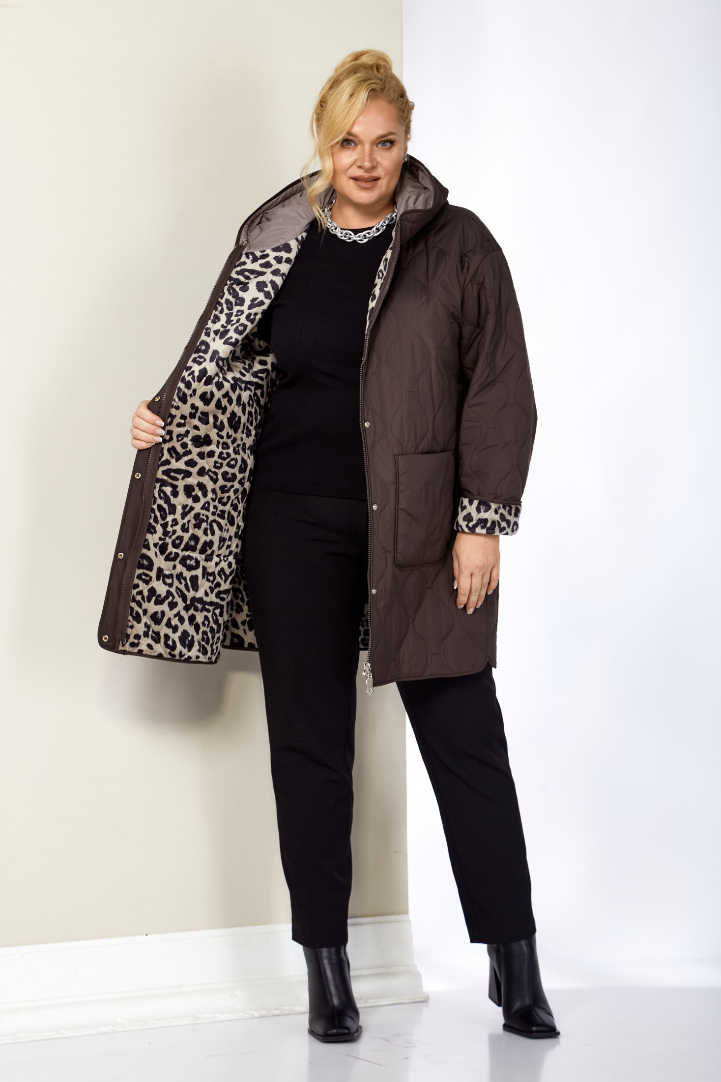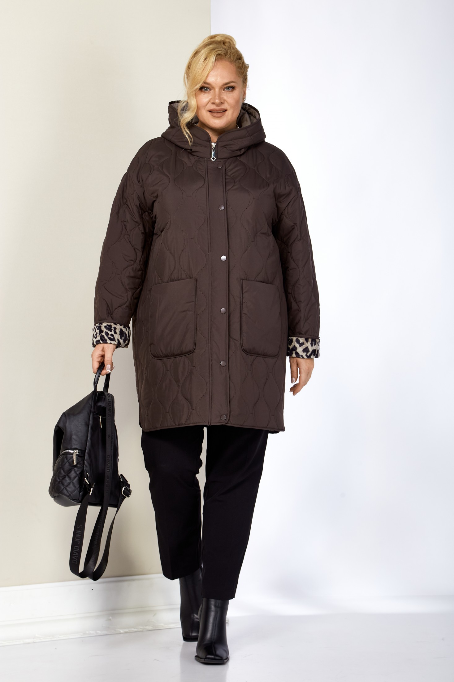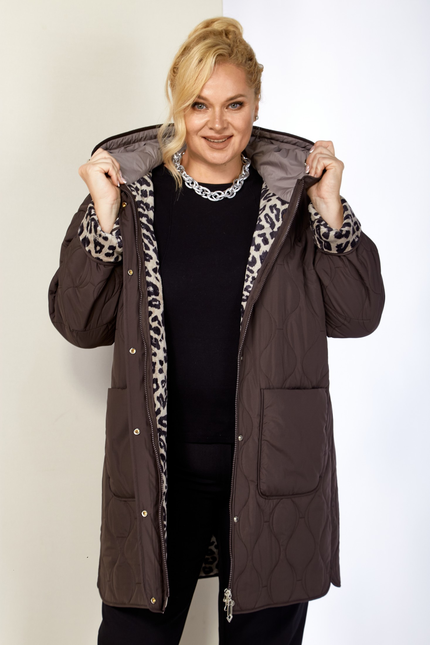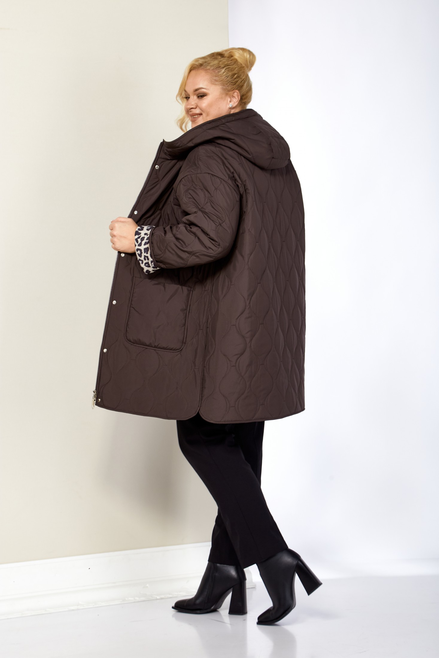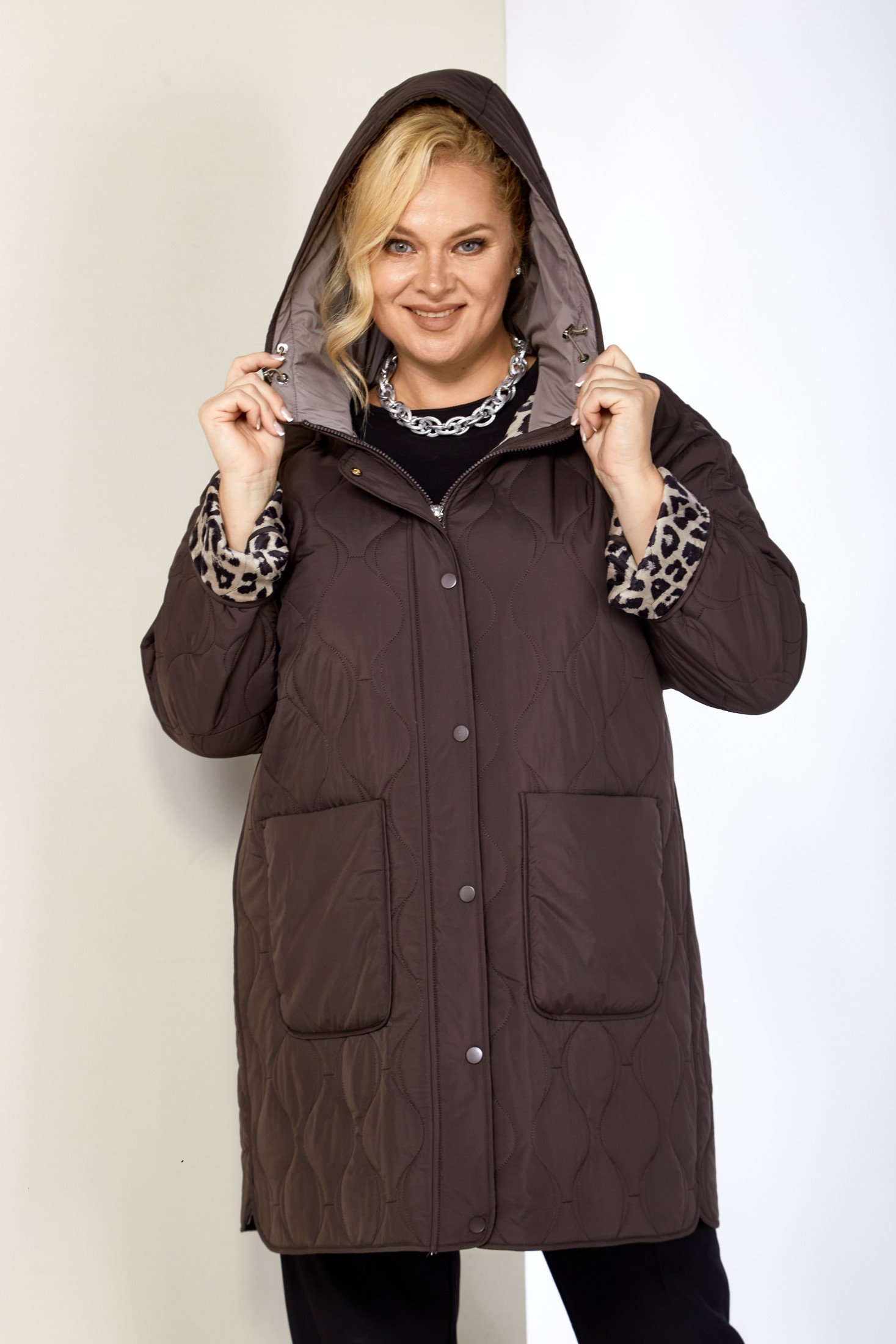 Модная утепленная демисезонная женская куртка на стеганной, мягкой плюшевой подкладке контрастного цвета. Представляет собой идеальный выбор на осень и весну для женщин, ищущих комфорт и стиль. Изделие выполнена из мягкой, матовой курточной ткани, при этом довольно легкой, с водоотталкивающей пропиткой, на тонком синтепоне. Все внутренние срезы и швы окантованы. Передняя часть куртки с накладными глубокими карманами на внутренних магнитах. Застежка центральная на двухбегунковой молнии (растегивается как снизу так и сверху) и планкой на металлические кнопки, имеет длину от линии низа до верхнего края воротника-стойки переходящего в капюшон. Капюшон глубокий, не съемный. Рукав со спущенной линией плеча с отворотом в тон подкладки, что придает изделию стильнось. Низ боковых швов фигурный. Куртка идеально подойдет для осенних дней, обеспечит теплом и комфортом. Благодаря своему стильному дизайну и высокому качеству исполнения, эта куртка станет незаменимой вещью в гардеробе. Толщина синтепона 100г/м2, изделие предназначено на осенне-весенний период с температурой воздуха до 0°C.