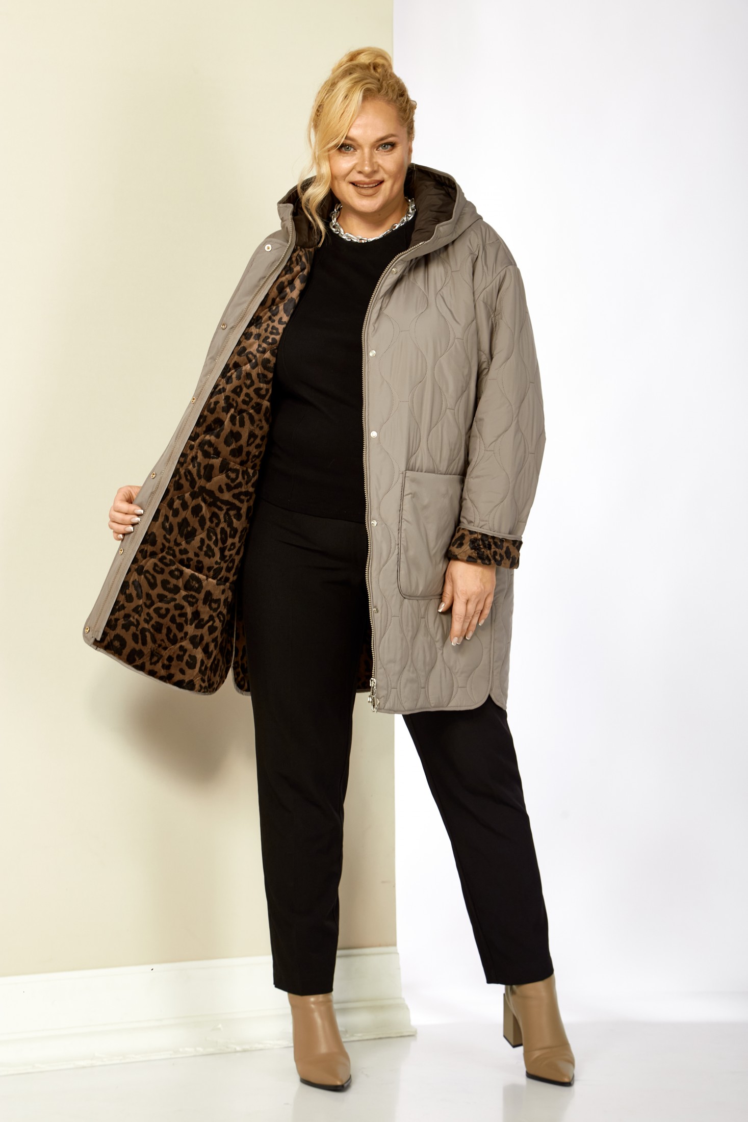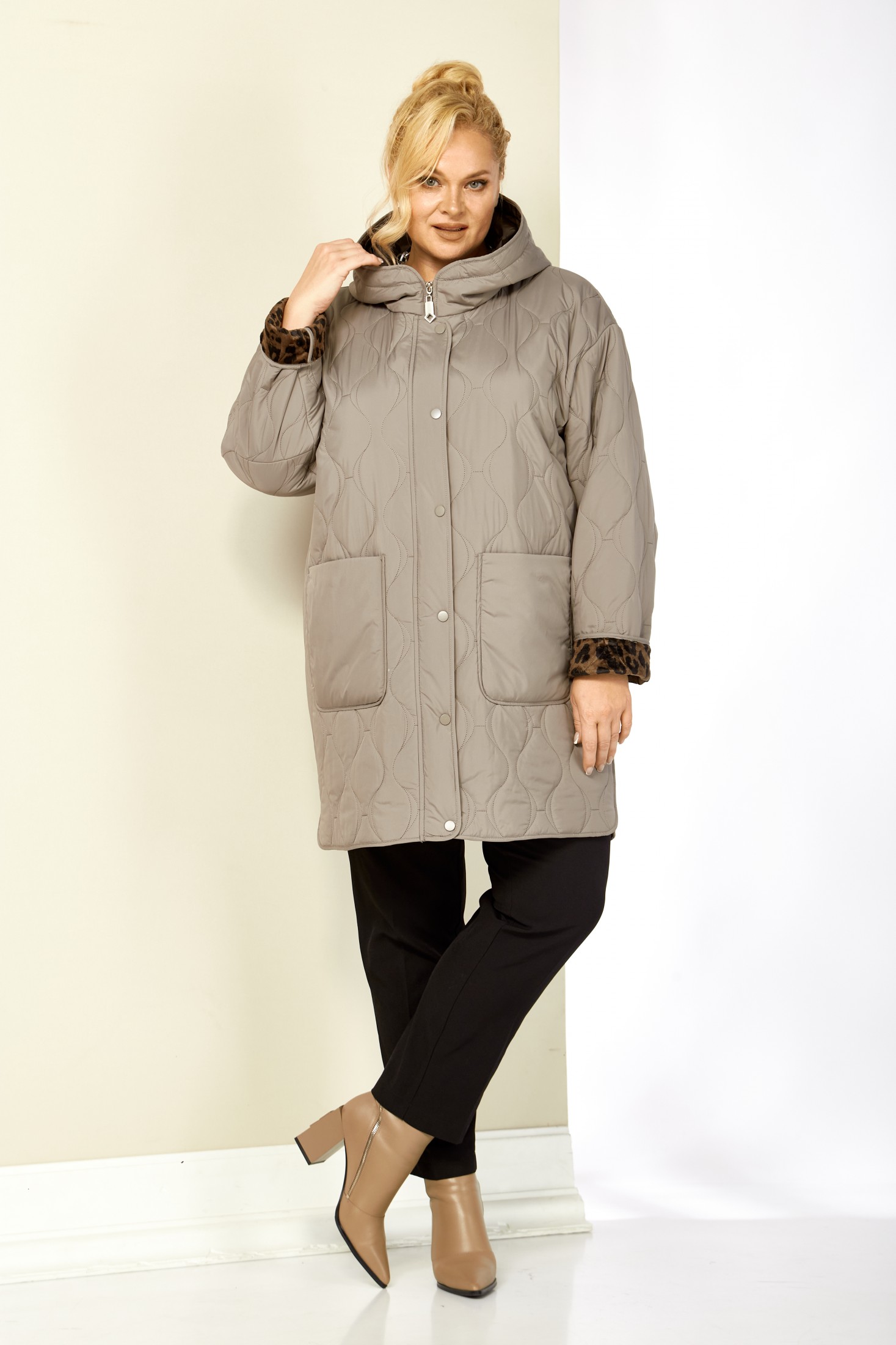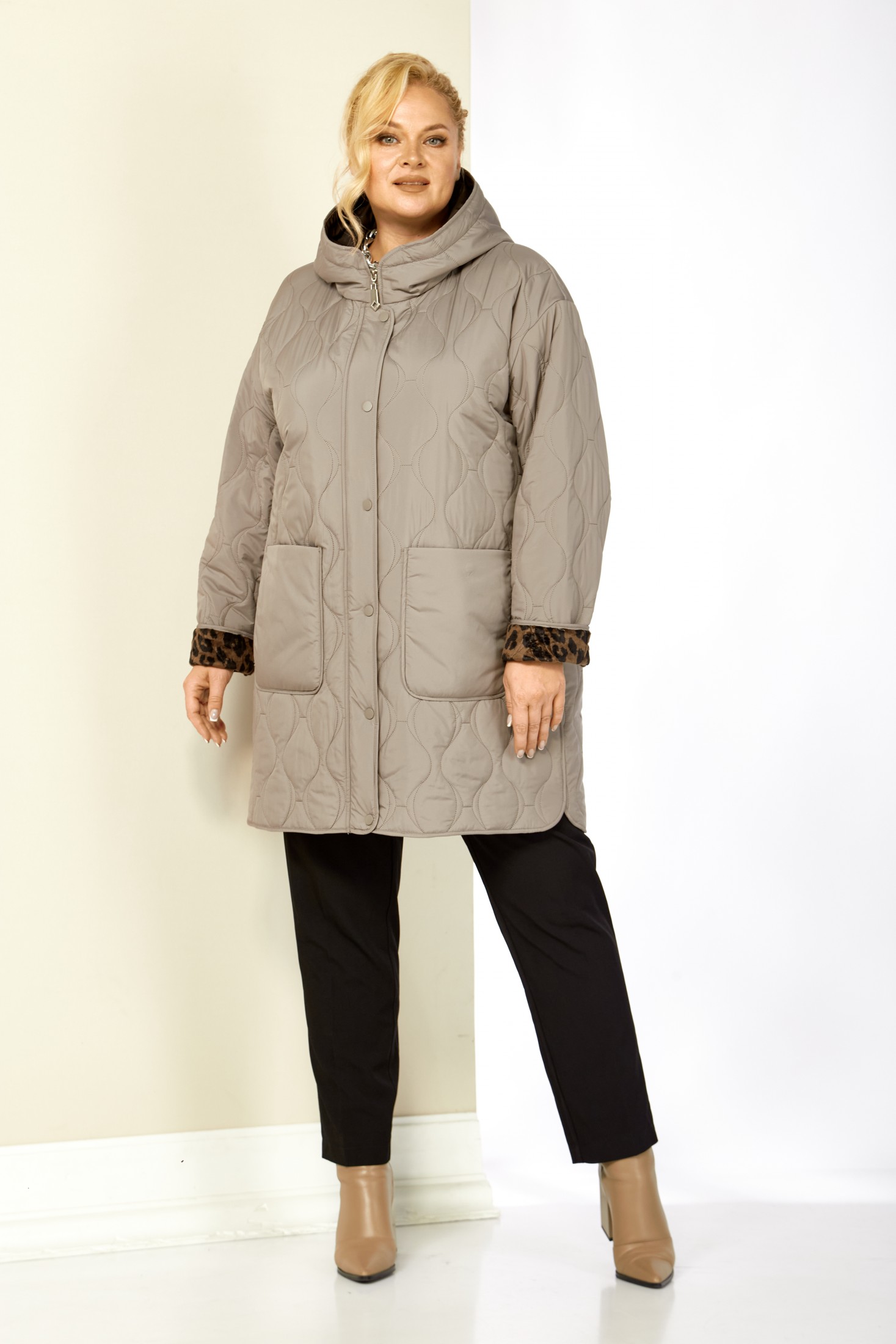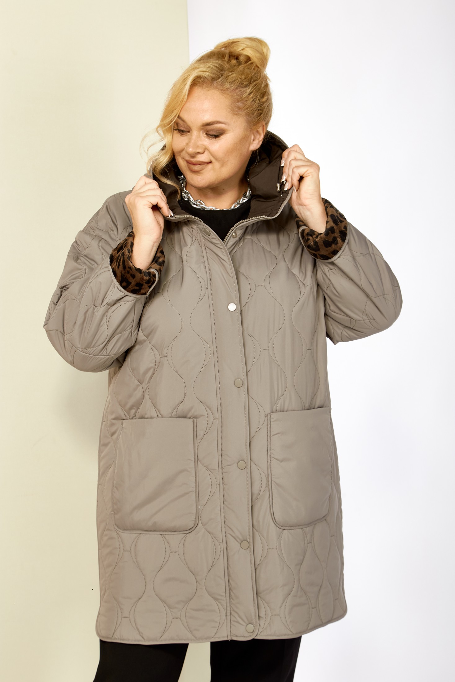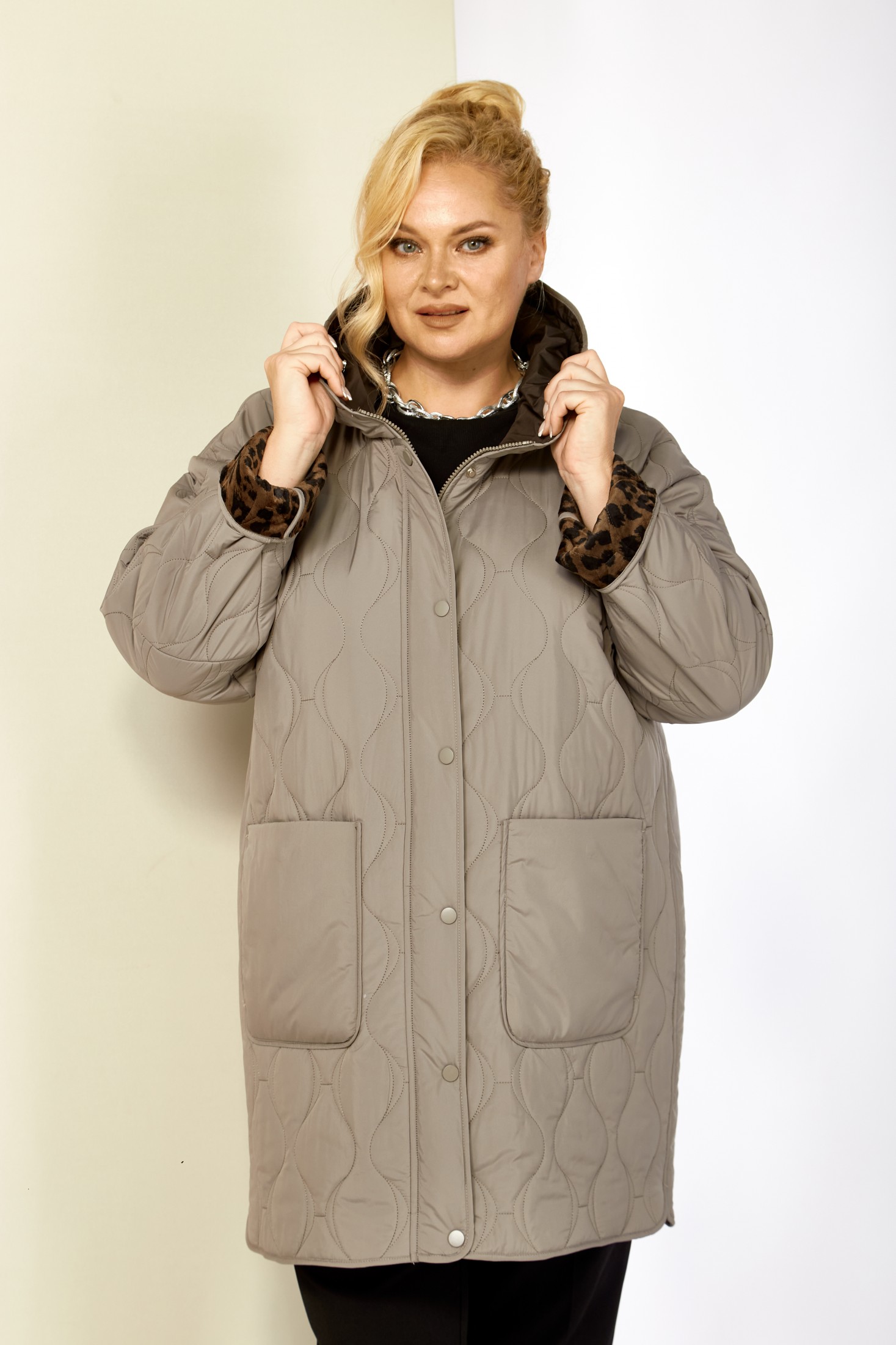 Модная утепленная демисезонная женская куртка на стеганной, мягкой плюшевой подкладке контрастного цвета. Представляет собой идеальный выбор на осень и весну для женщин, ищущих комфорт и стиль. Изделие выполнена из мягкой, матовой курточной ткани, при этом довольно легкой, с водоотталкивающей пропиткой, на тонком синтепоне. Все внутренние срезы и швы окантованы. Передняя часть куртки с накладными глубокими карманами на внутренних магнитах. Застежка центральная на двухбегунковой молнии (растегивается как снизу так и сверху) и планкой на металлические кнопки, имеет длину от линии низа до верхнего края воротника-стойки переходящего в капюшон. Капюшон глубокий, не съемный. Рукав со спущенной линией плеча с отворотом в тон подкладки, что придает изделию стильнось. Низ боковых швов фигурный. Куртка идеально подойдет для осенних дней, обеспечит теплом и комфортом. Благодаря своему стильному дизайну и высокому качеству исполнения, эта куртка станет незаменимой вещью в гардеробе. Толщина синтепона 100г/м2, изделие предназначено на осенне-весенний период с температурой воздуха до 0°C.