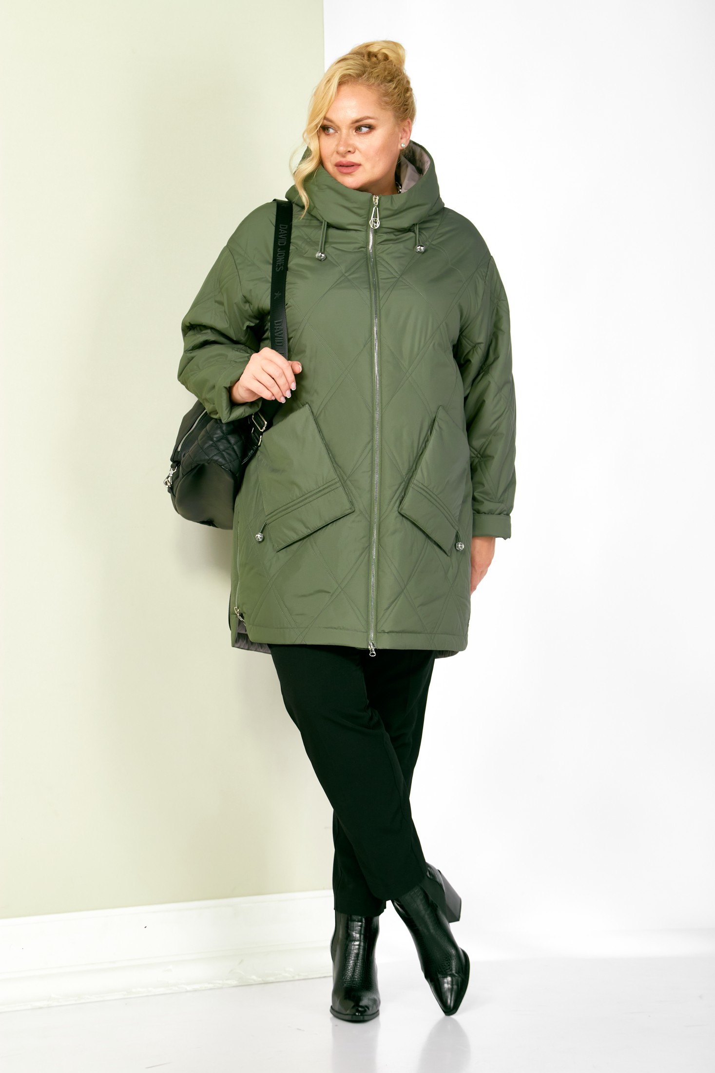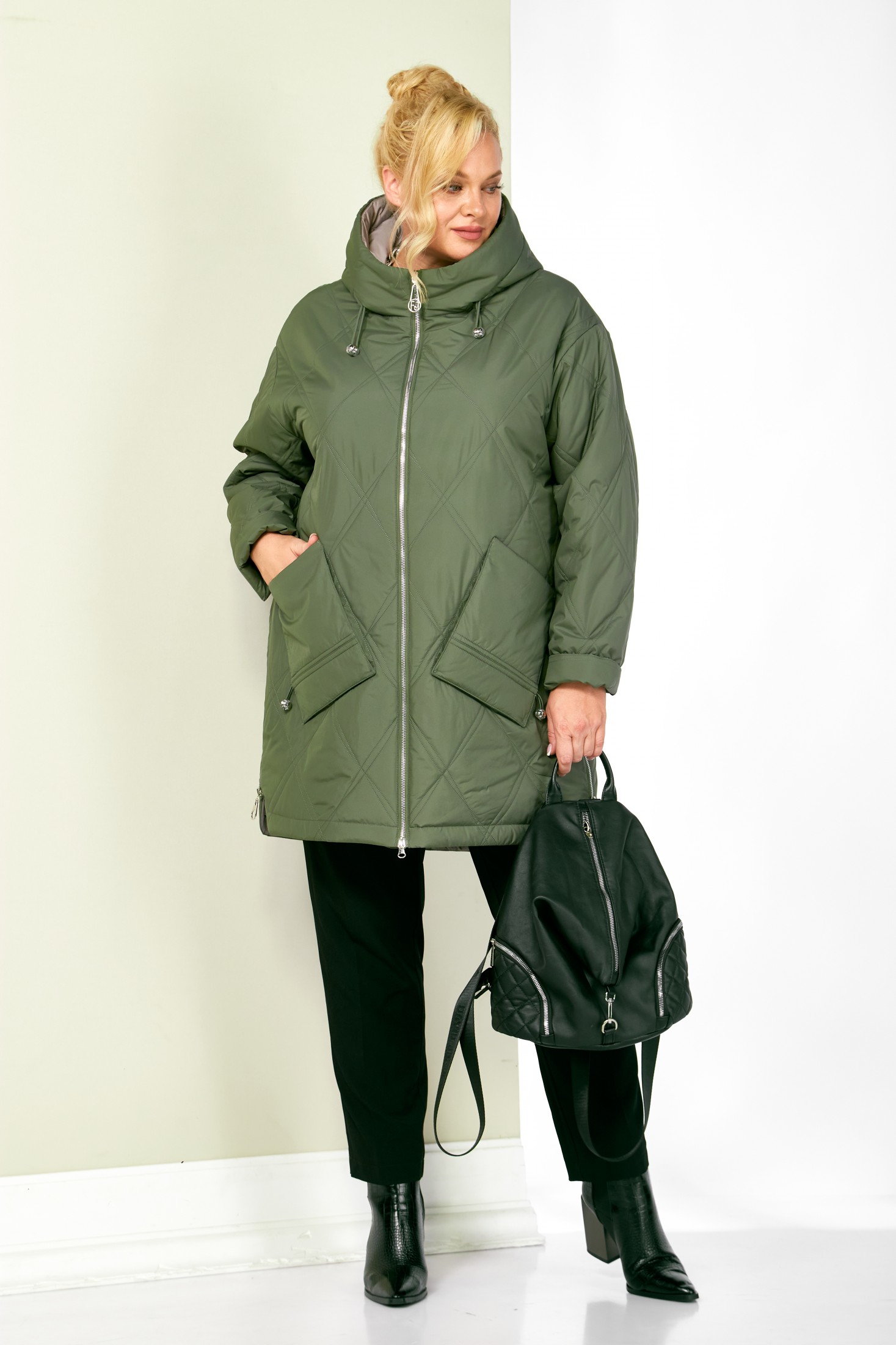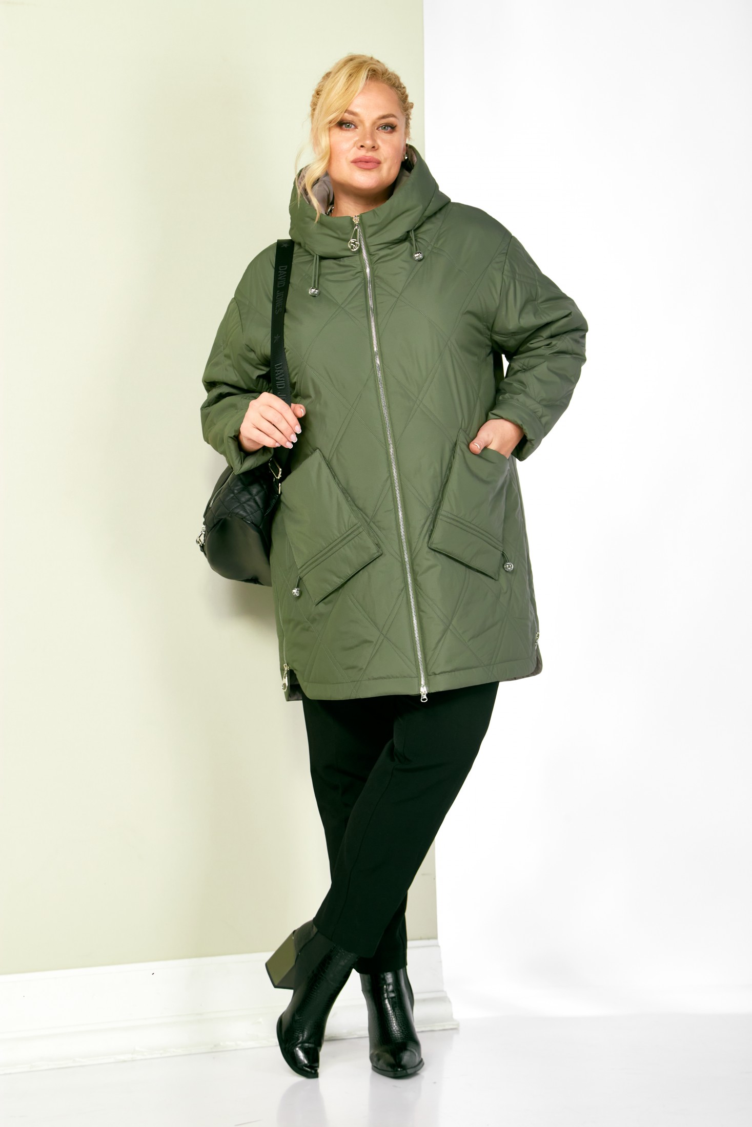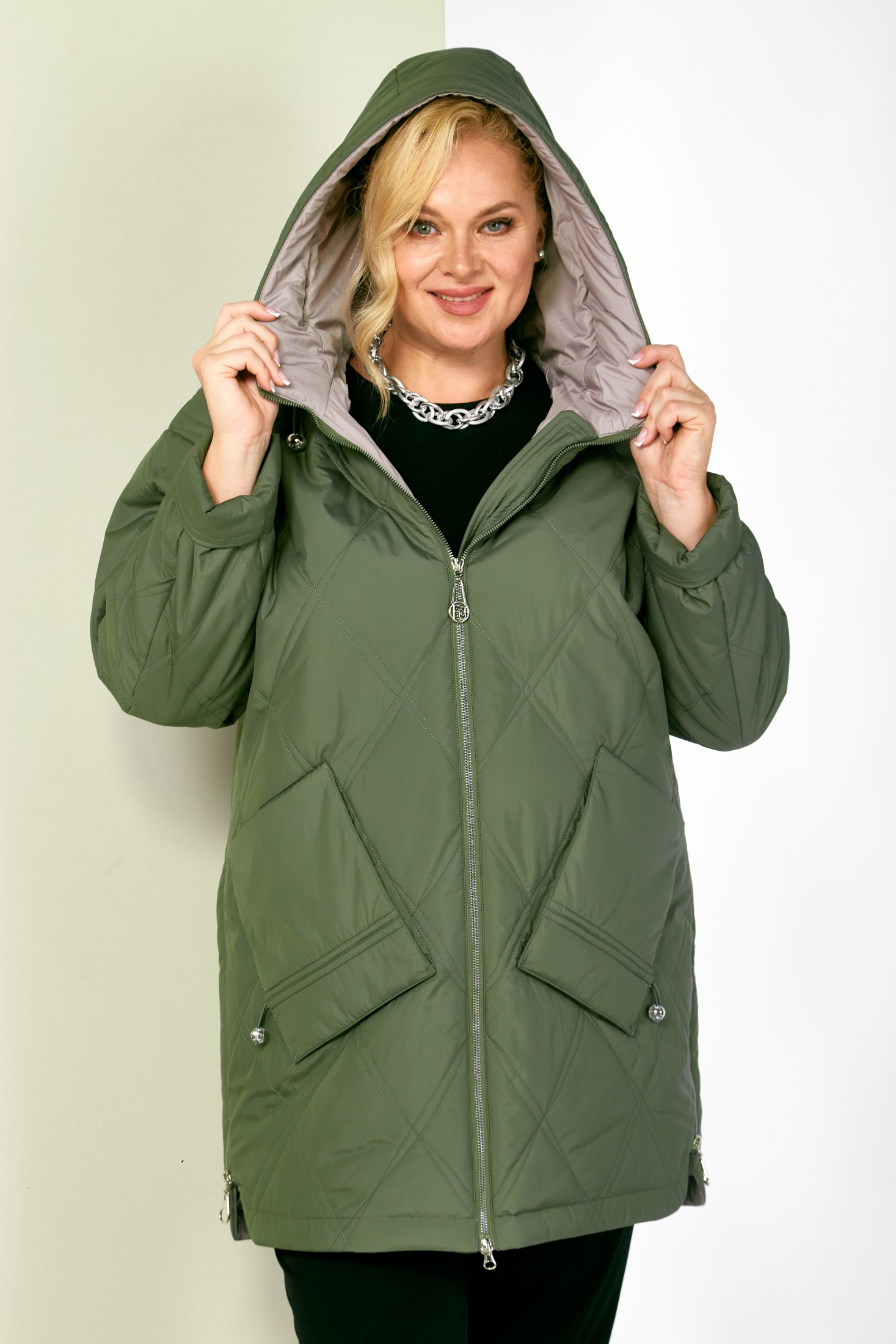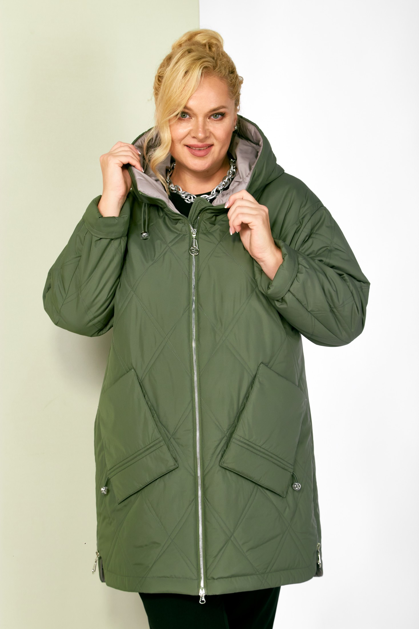 Стильная демисезонная куртка сезона осень-весна, прямого силуэта, с воротником-стойкой переходящим в капюшон. Куртка повседневная удобная в носке, лёгкая в уходе и теплая. Застежка центральная на молнии с двумя бегунками, которая подарит вам свободу движения и подойдет для автоледи. Изделие выполнено из курточной ткани высокого качества, на тонком мягком синтепоне. На подкладке. Капюшон не съемный, регулируется декоративным шнуром. По переду куртки удобные глубокие накладные карманы на внутренних магнитах. Рукав со спущенной линией плеча, длина регулируется с помощью отворота. С внутренней стороны куртки имеется внутренний карман. Нижняя часть боковых швов декорирована молниями (функциональные), что делает её удобной в носке.
