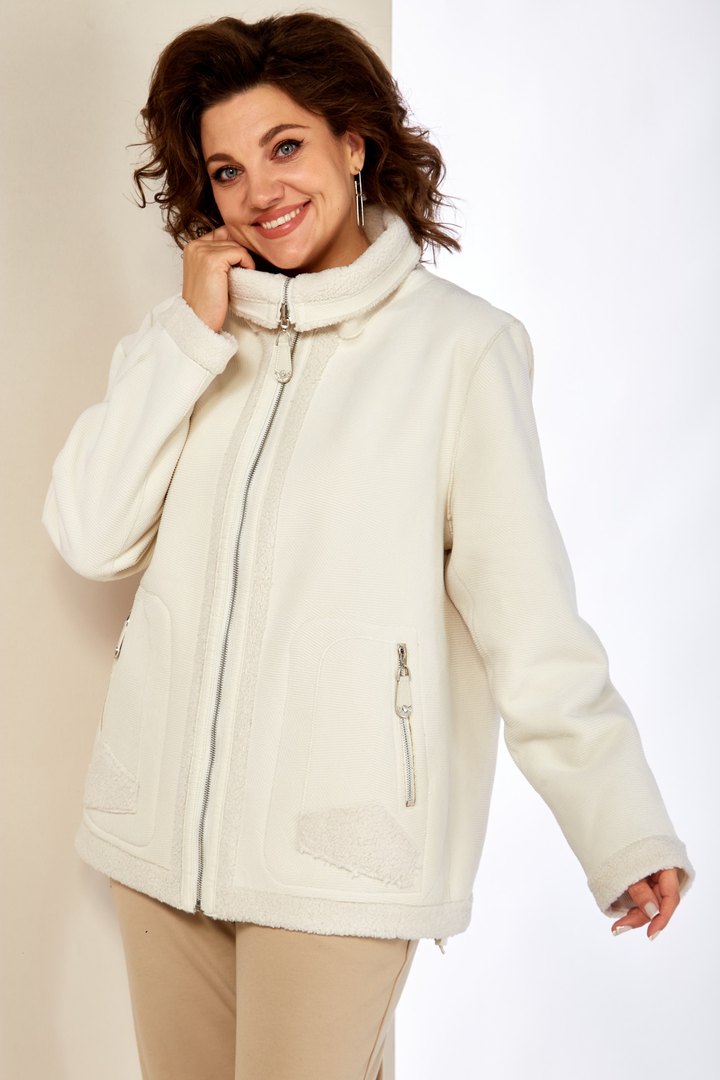 Представляем стильный жакет с воротником-стойкой, классического кроя с декоративными элементами в виде отделки из эко-меха. Жакет выполнен из качественных материалов, включая плотный, мягкий трикотаж в рубчик и эко-мех. Застежка центральная на молнию с двойным бегунком. По переду жакета функциональные накладные, прорезные карманы на молнии с оригинальной кожаной подвеской в тон основной ткани. По низу рукавов и низа изделия отделка с эко-меха, что придает изделию оригинальный вид. Рукав втачной.