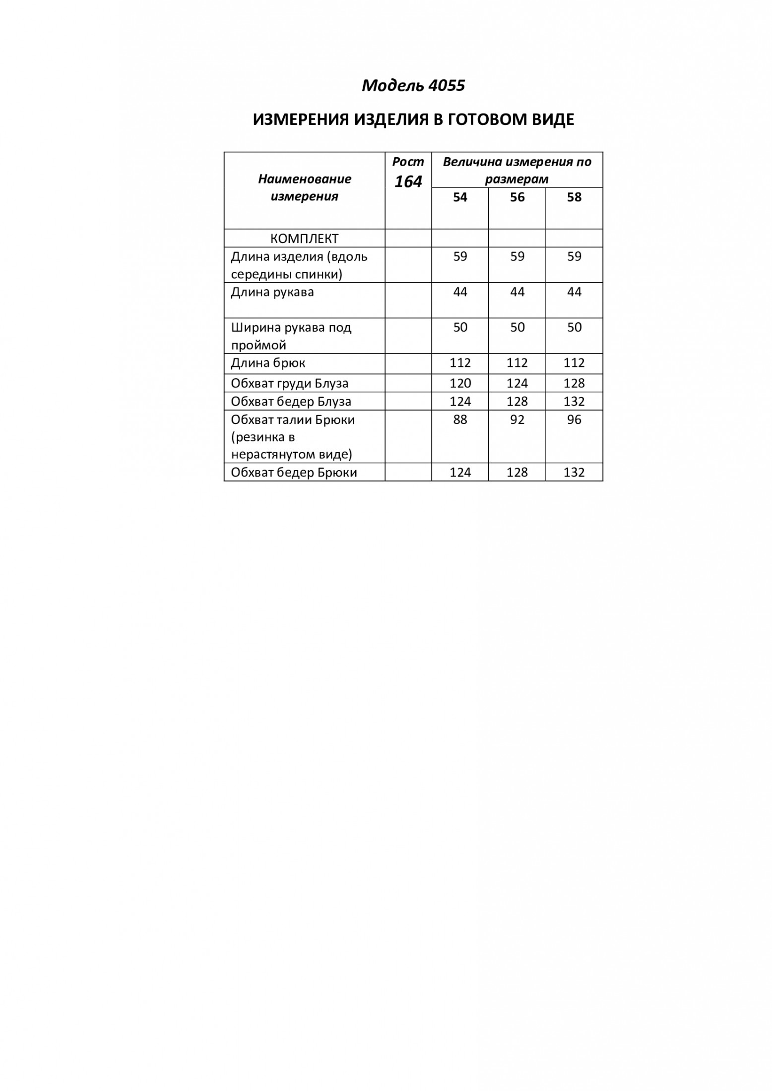 Длина брюк по боковому шву с поясом 112 см. Длина блузы по центральному шву спинки с поясом 59 см. Длина рукава от основания шеи 44 см.