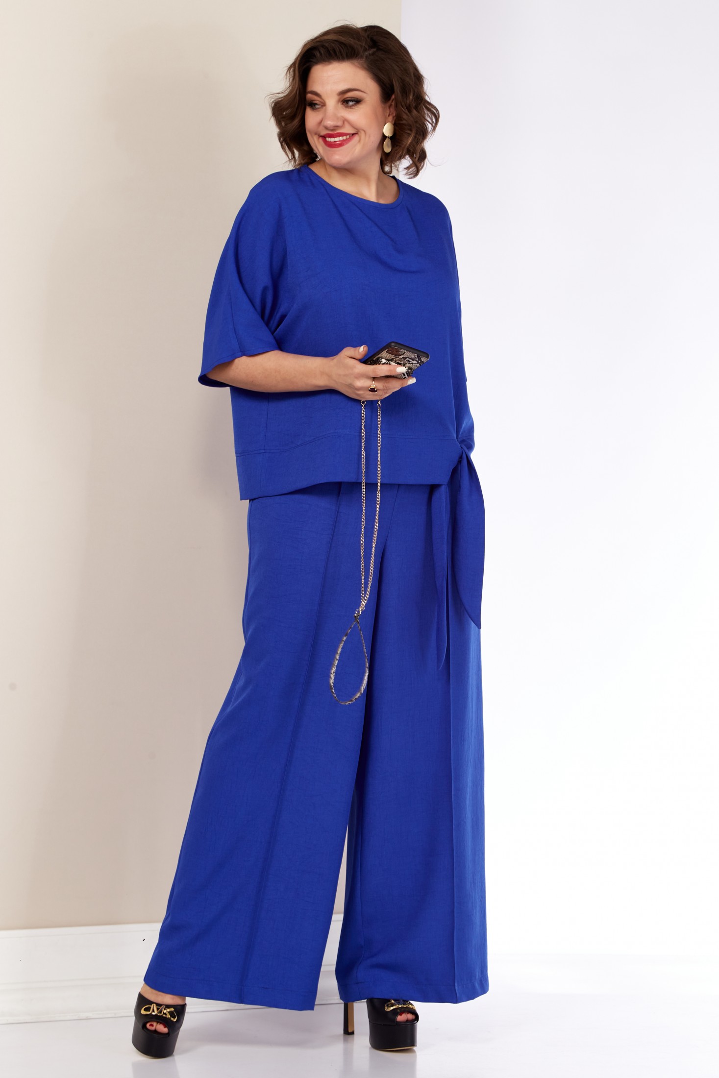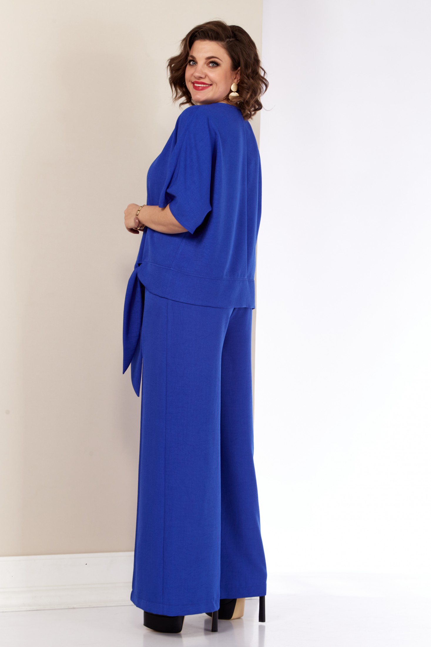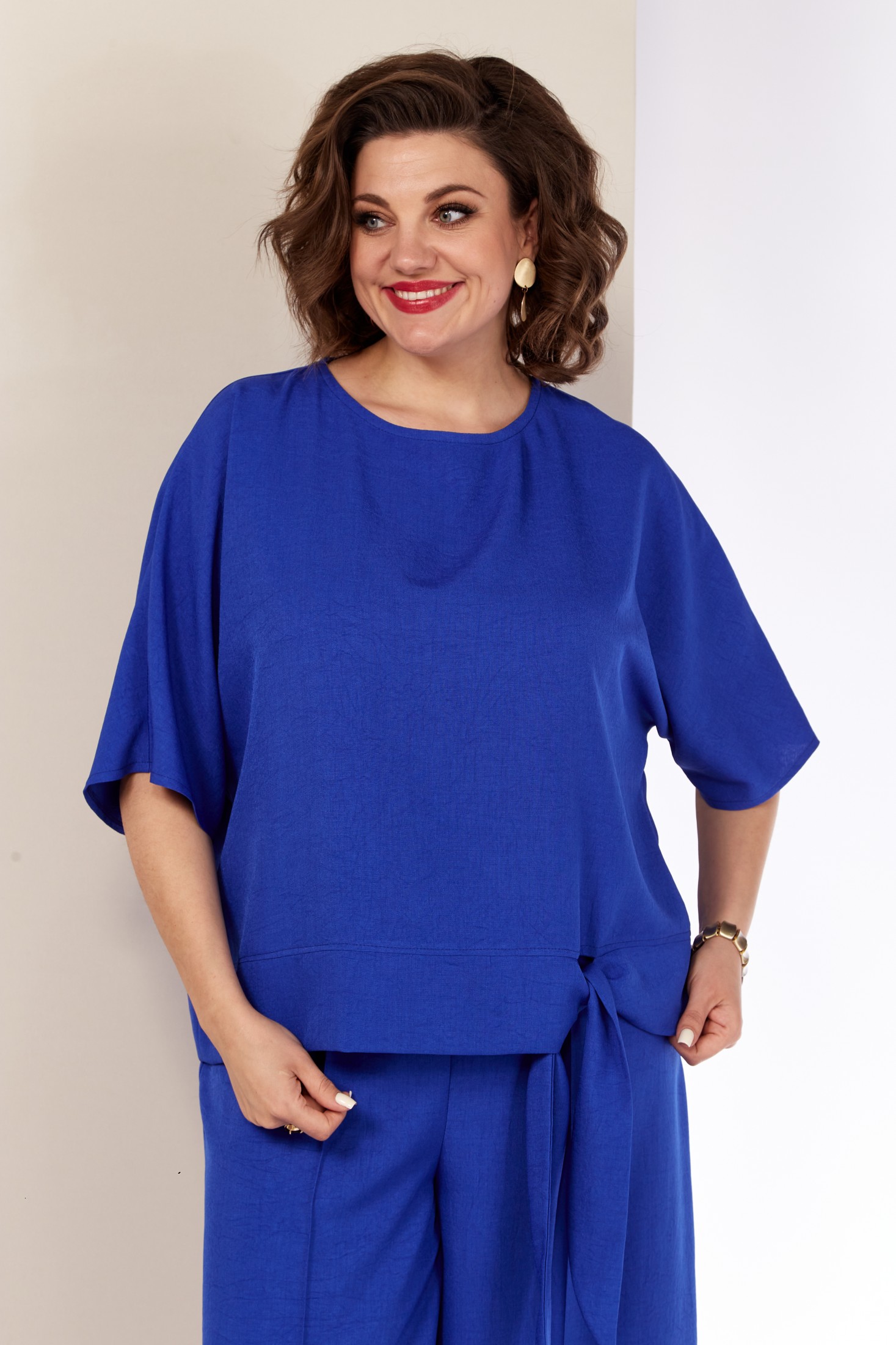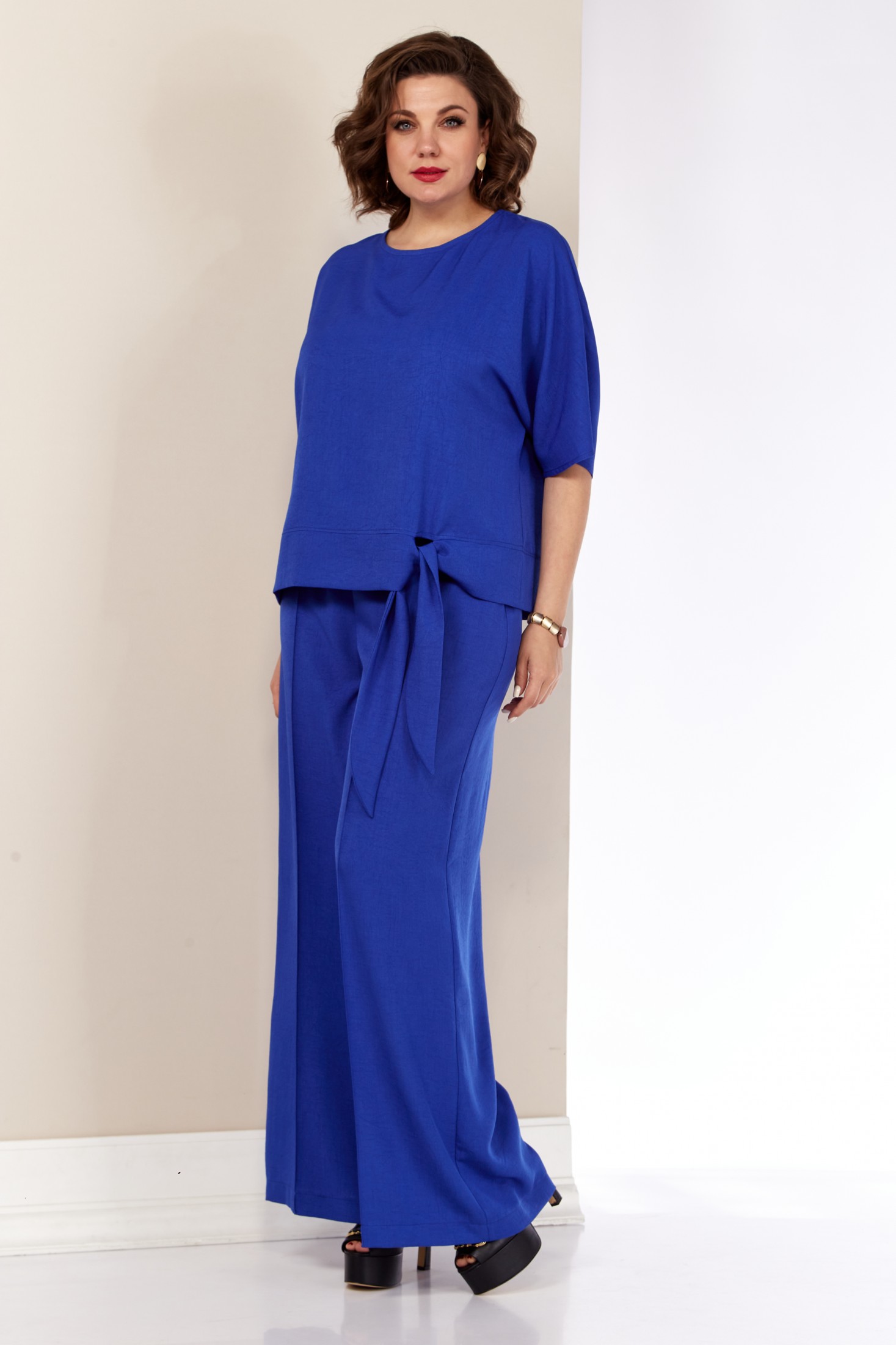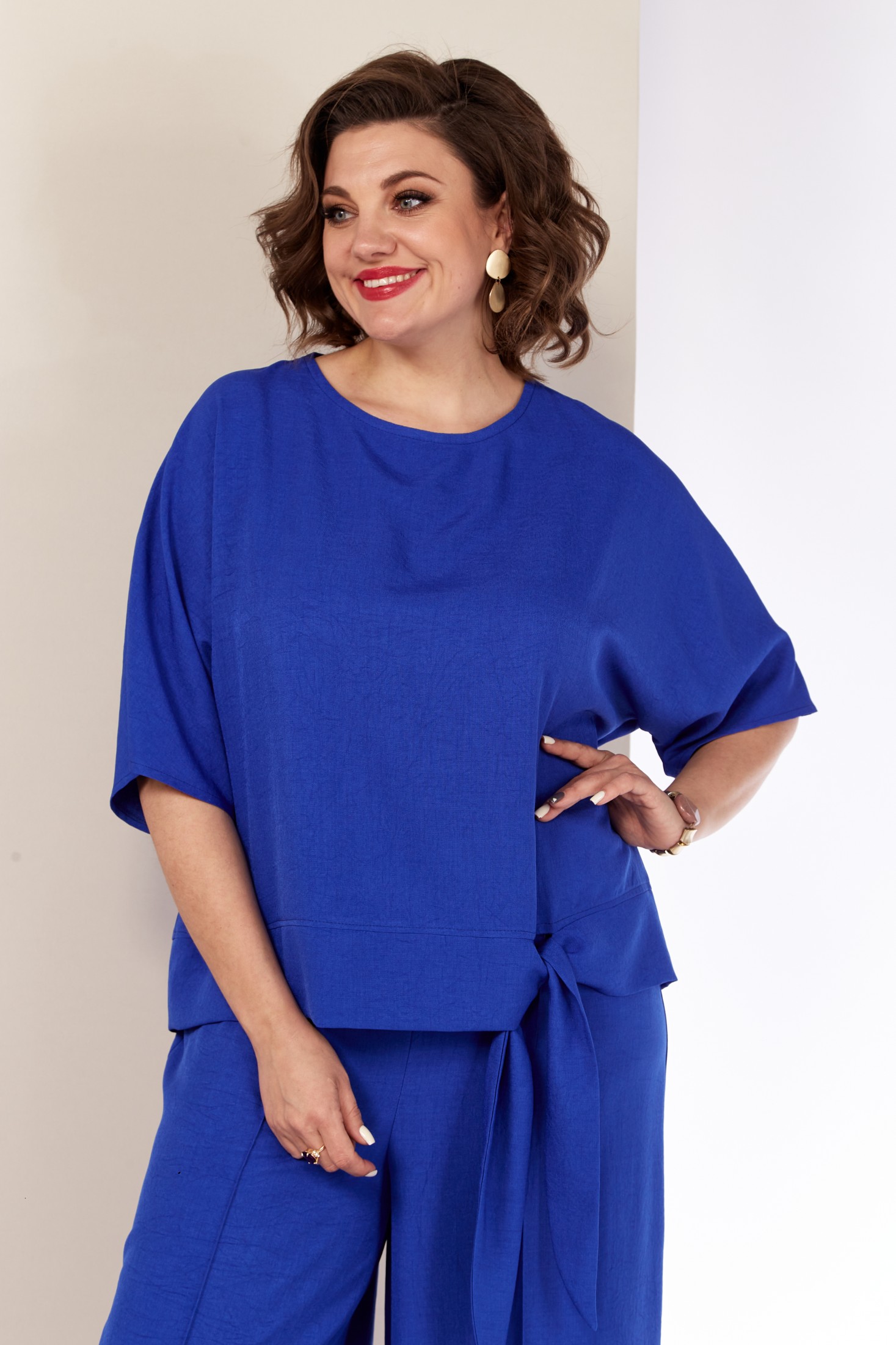 Стильный летний комплект двойка, состоящий из блузы и брюк. Блуза свободного силуэта, с притачным широким поясом на завязку. Вырез горловины округлой формы. Рукав цельнокроеный. Спинка с центральным швом.