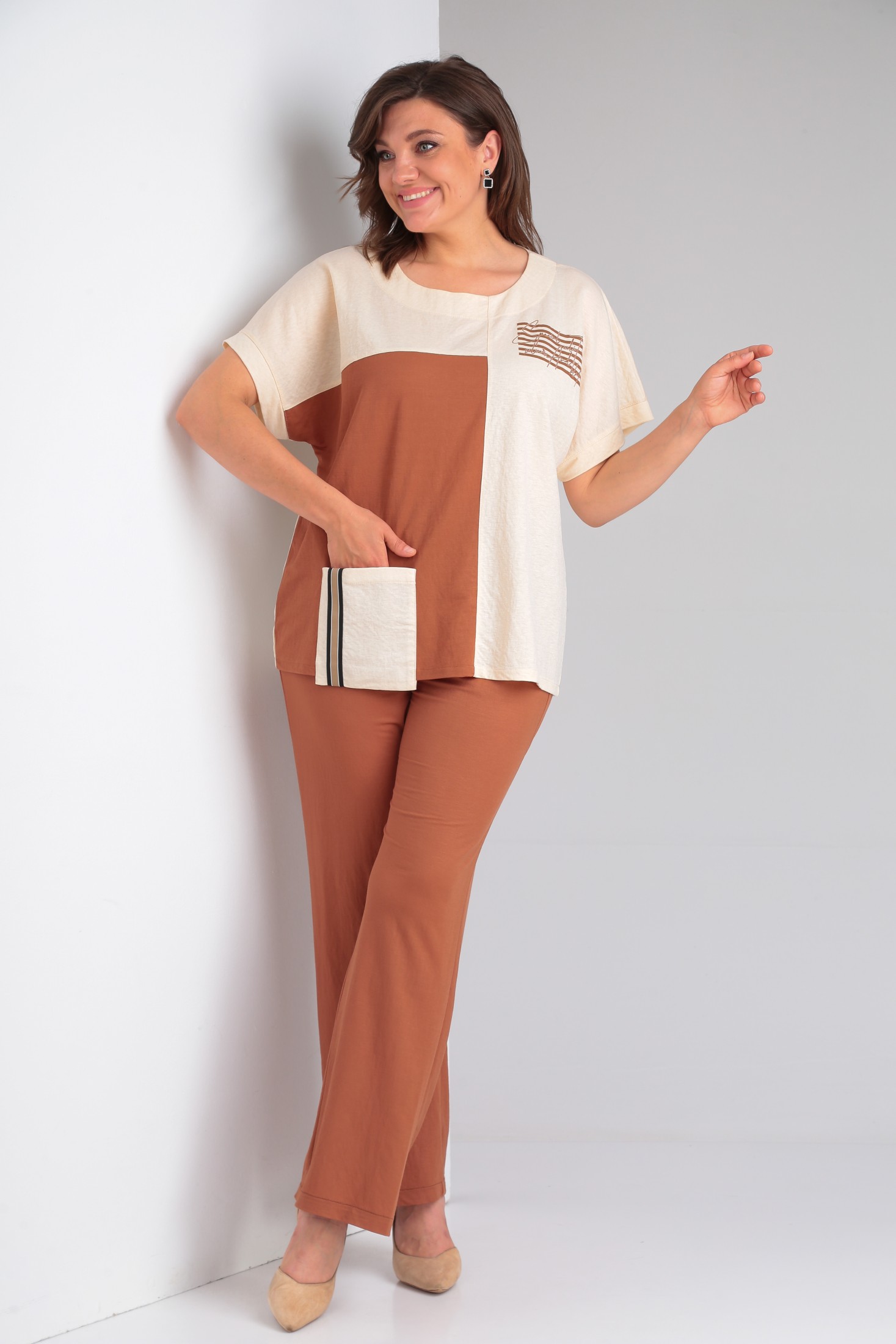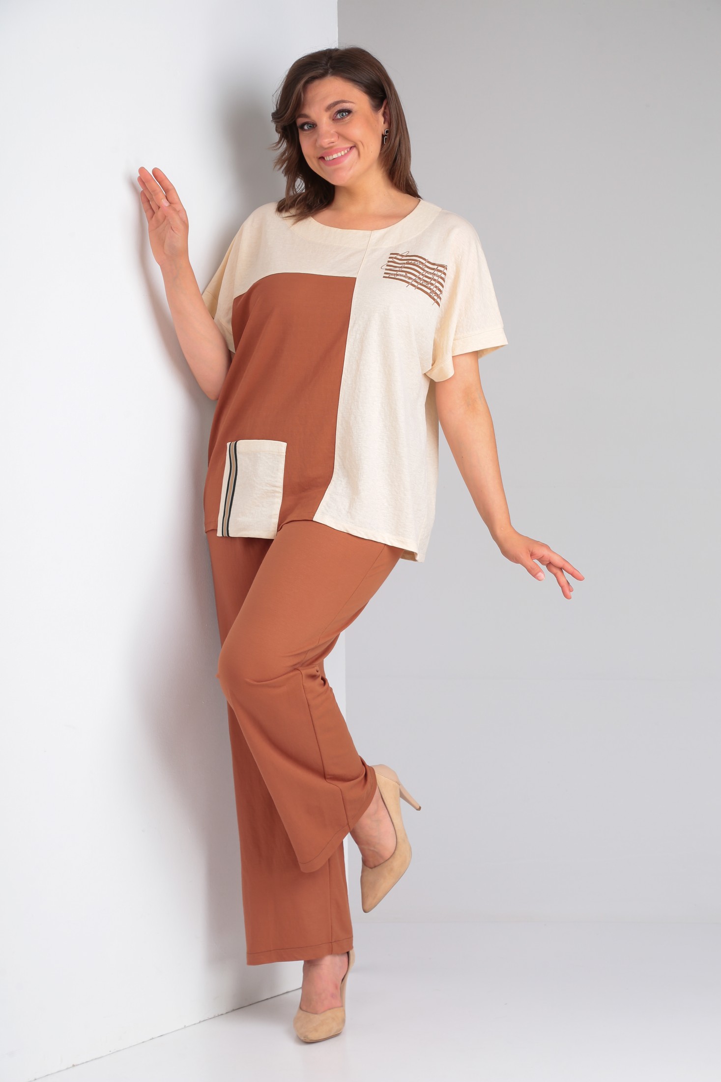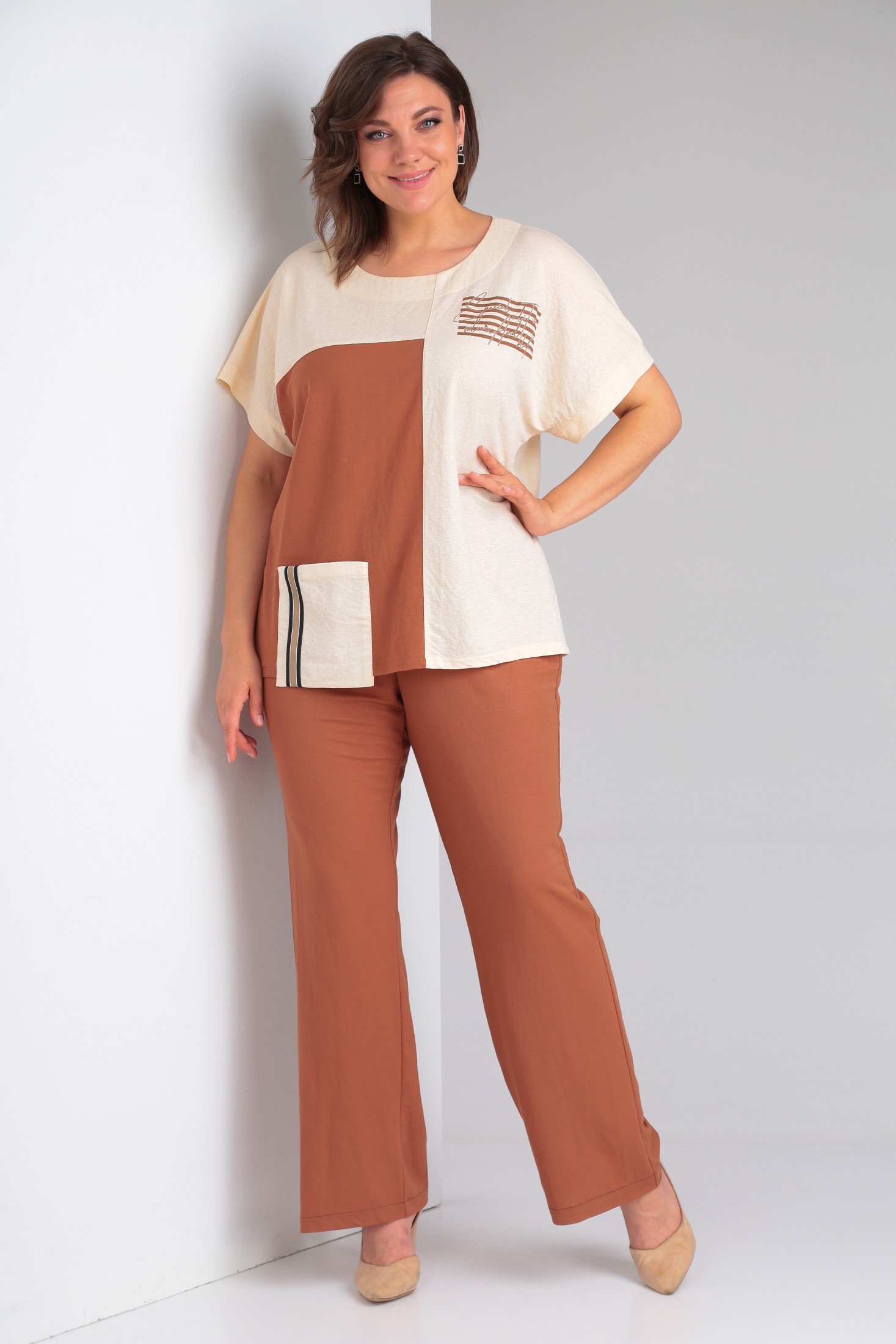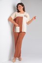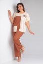 Стильный 2-х предметный комплект, состоящий из блузы и брюк. Блузка прямого силуэта из трикотажной вискозной ткани 2-х цветов, со спущенным коротким рукавом. Вырез горловины круглой формы. Горловина и низ рукава обработаны бейкой. По переду футболка украшена накладным карманом. Верхняя часть задекорирована печатью. Брюки прямые, классические, на уровне бедер в швах функциональные внутренние карманы. Верх брюк оформлен отрезным поясом с резинкой. Оба изделия можно смело комбинировать с другими вещами и обувью Вашего гардероба.