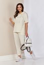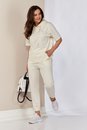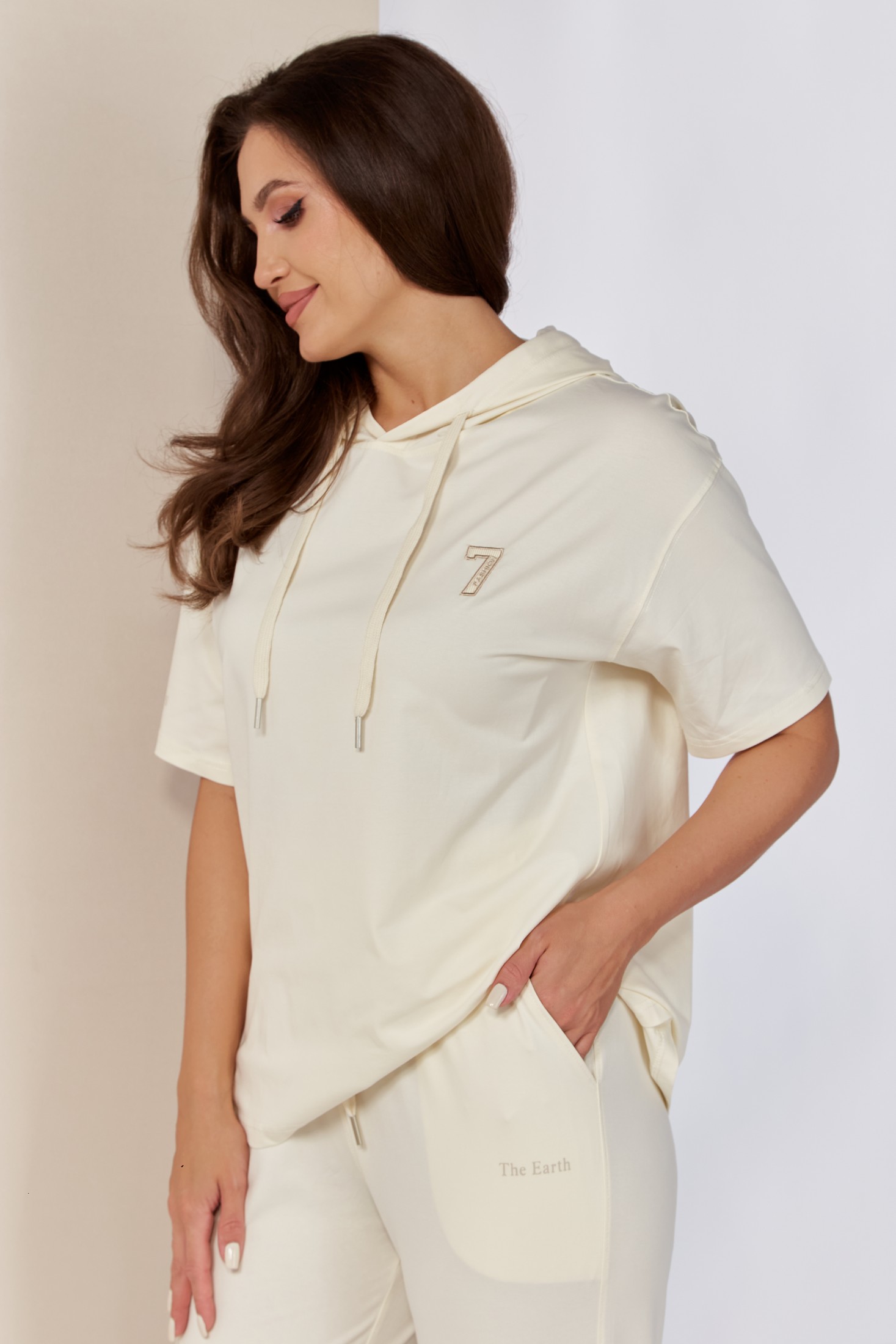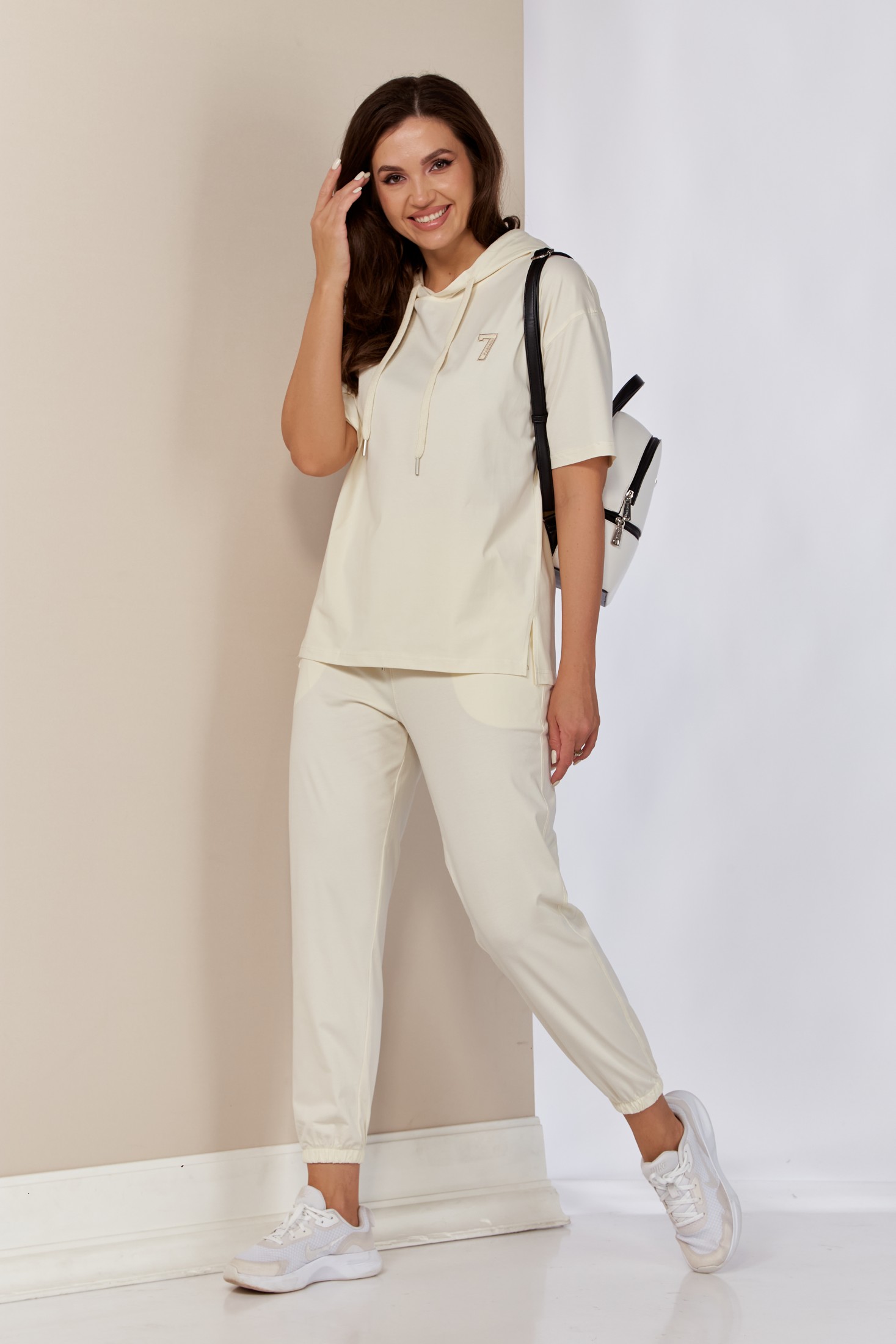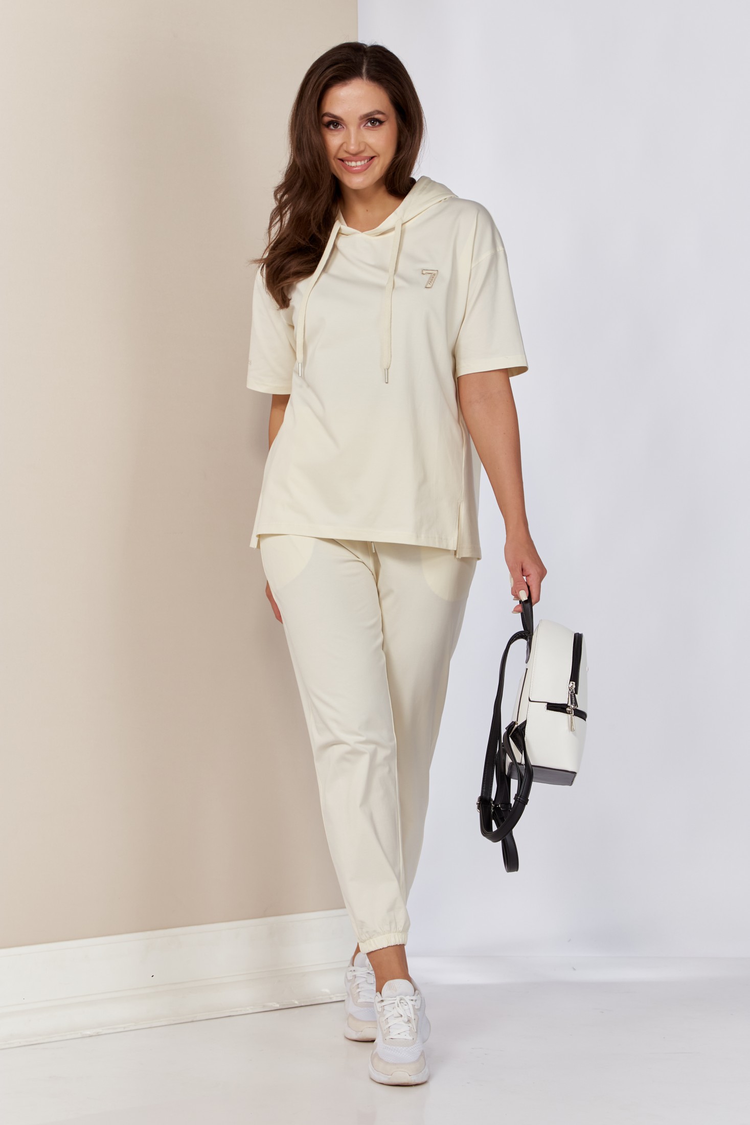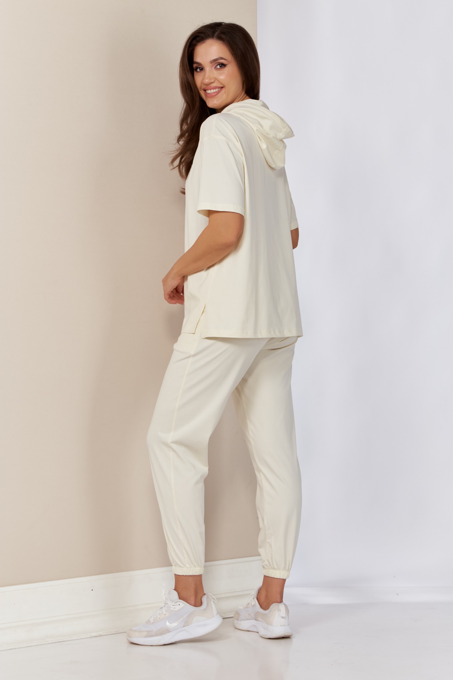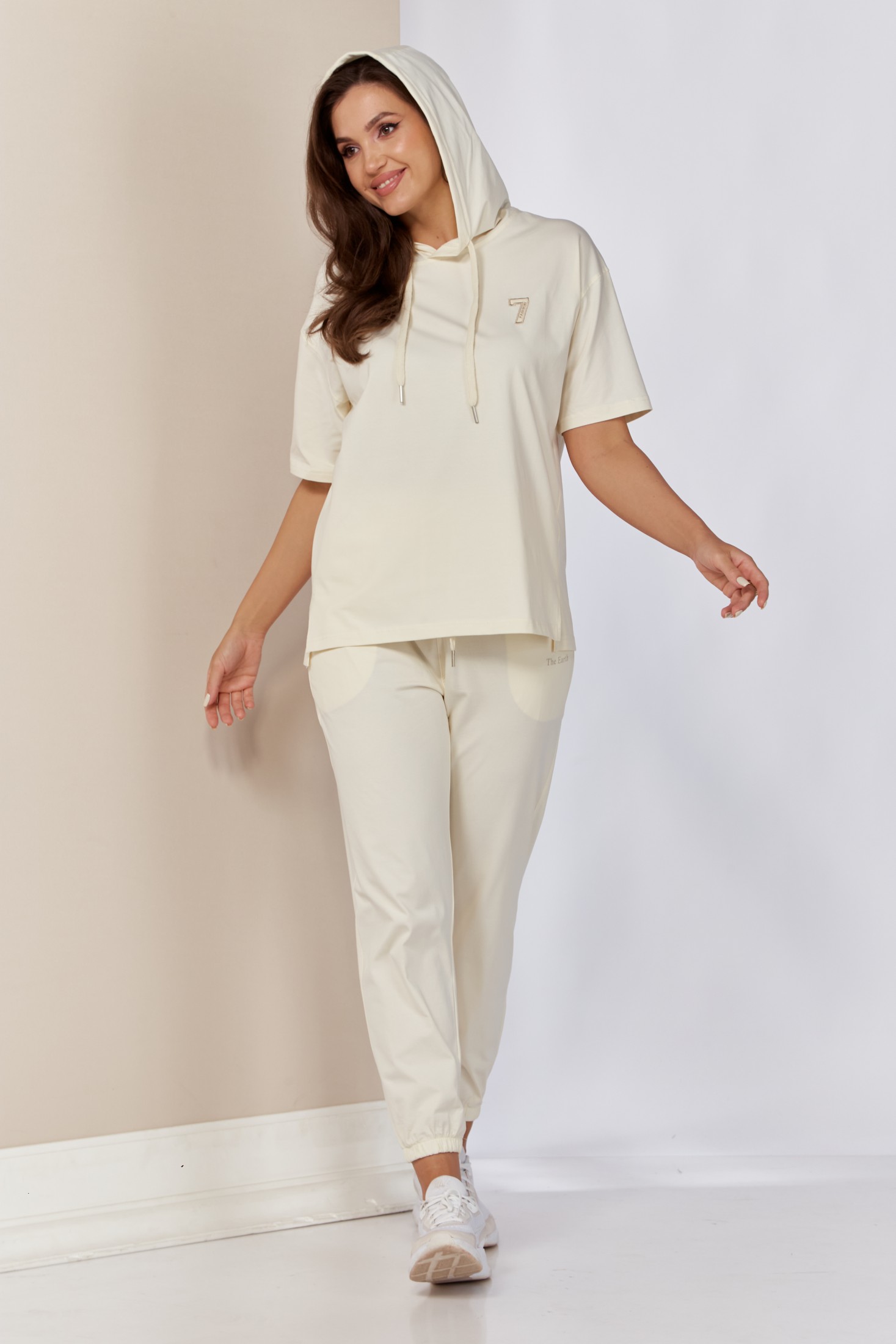 Стильный женский костюм выполнен из мягкого трикотажного полотна с добавлением хлопка. В костюм входят женские брюки с высокой посадкой на резинке и футболка с капюшоном. Футболка прямого силуэта, рукав короткий. В боковых швах разрезы (9 см). Брюки прямые, свободные, слегка заужены к низу, за счет резинки. На уровне бедер в швах функциональные внутренние карманы. Верх брюк оформлен отрезным поясом с резинкой. Оба изделия можно смело комбинировать с другими вещами и обувью Вашего гардероба. Вы можете использовать костюм как повседневную или спортивную одежду.