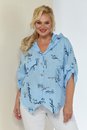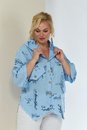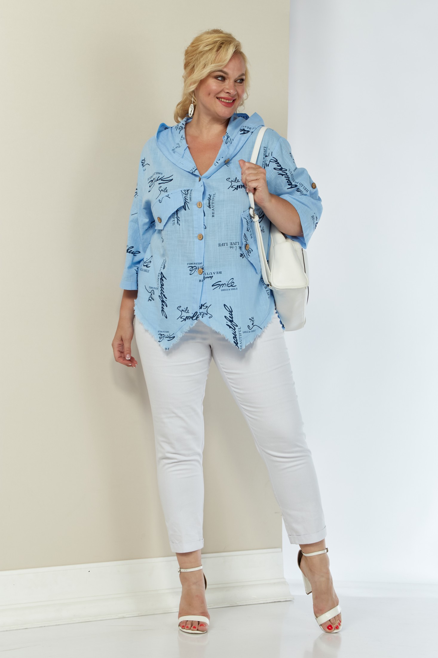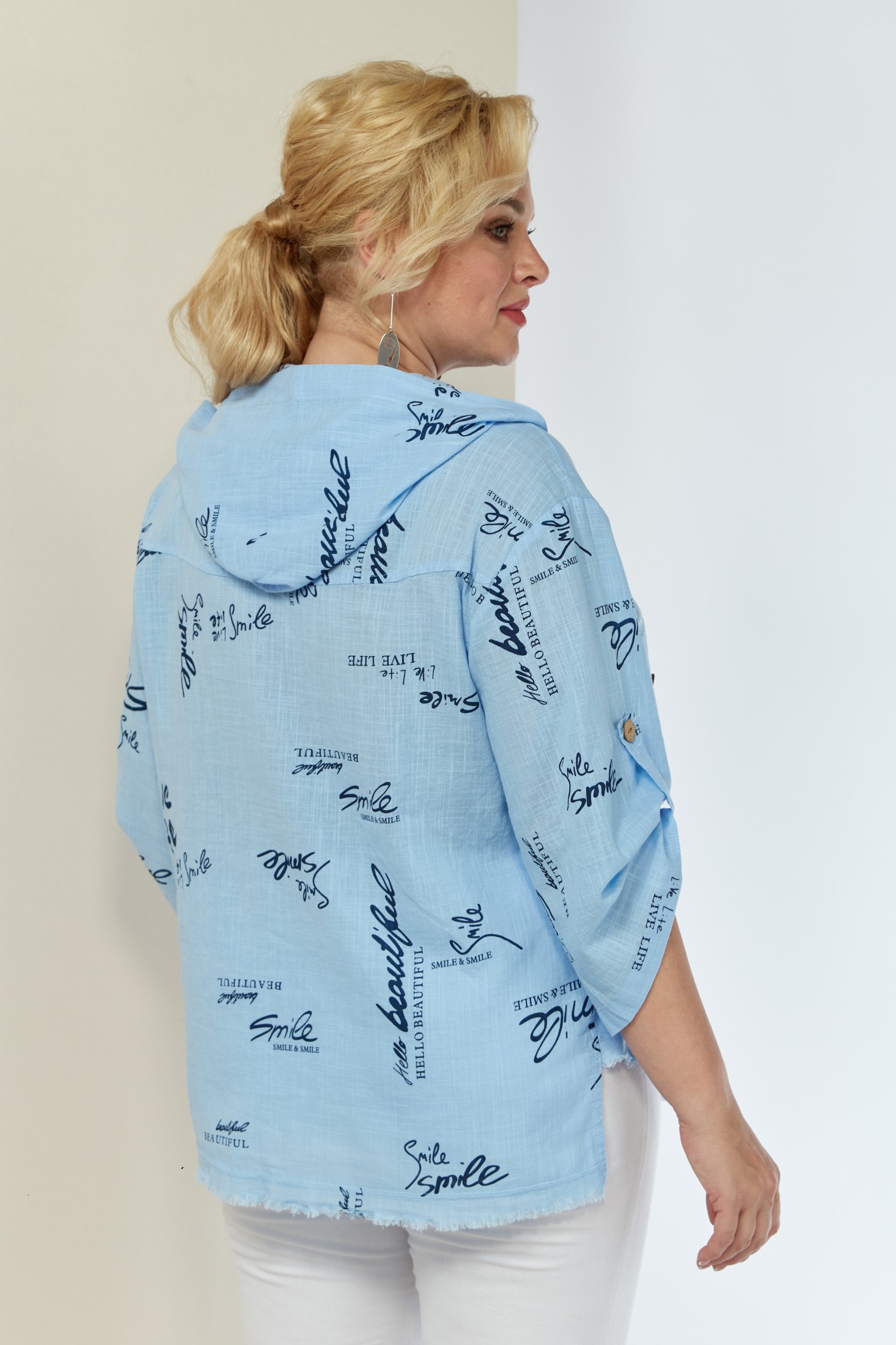 Летняя льняная рубашка с принтом. Изделие с центральной застежкой на пуговицы. Полочка с ассиметричными подрезами и декоративными клапанами. Рукав трансформер, со спущенной линией плеча, регулируется при помощи паты и пуговицы. Спинка с отрезной кокеткой. Капюшон втачной. Рубашка имеет ассиметричный низ (спинка 69 см, перед - 65 см). Изделие без подкладки. Модель прекрасно сочетается с шортами, брюкам, юбками и подойдет на любой тип фигуры.
