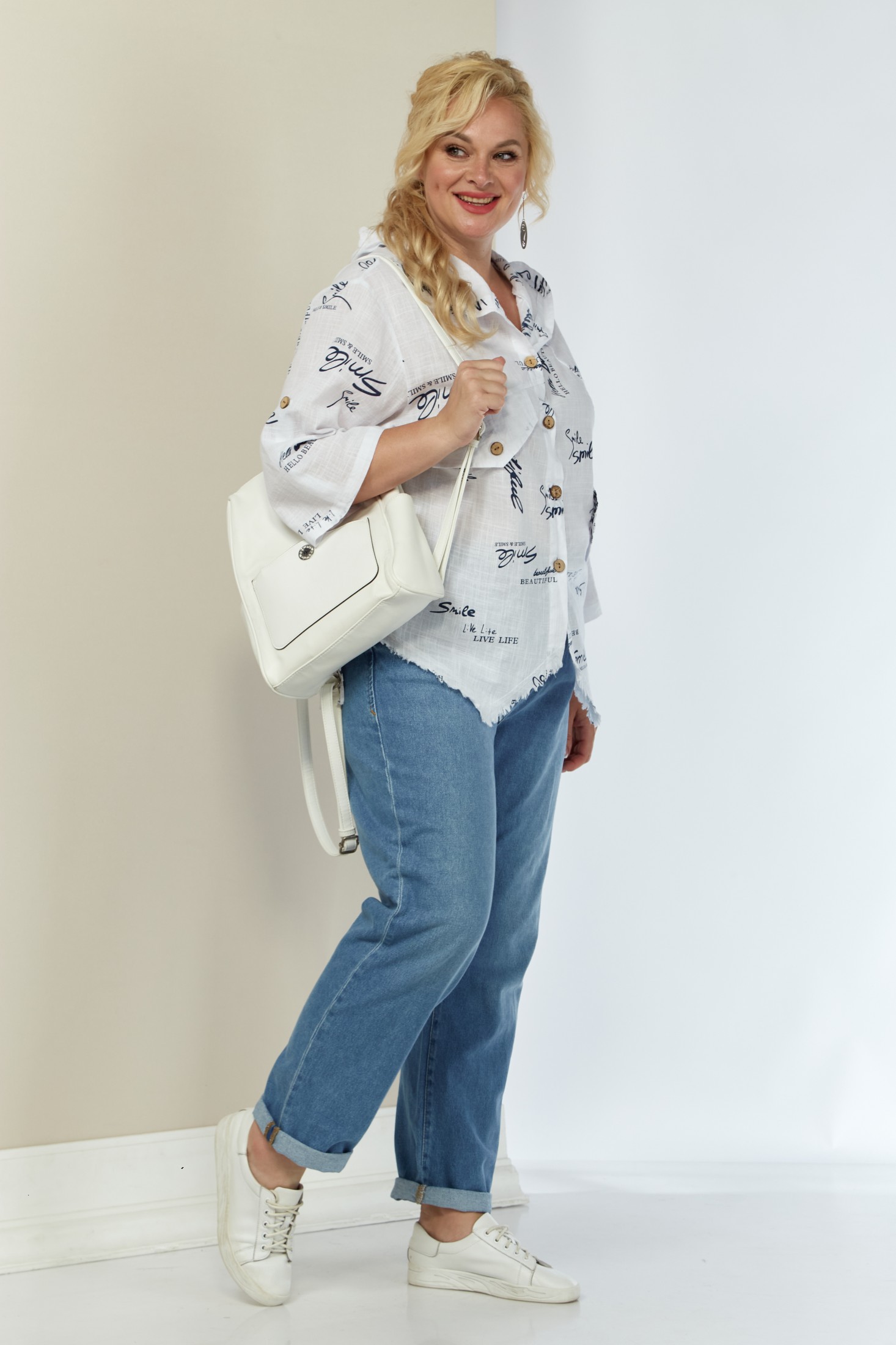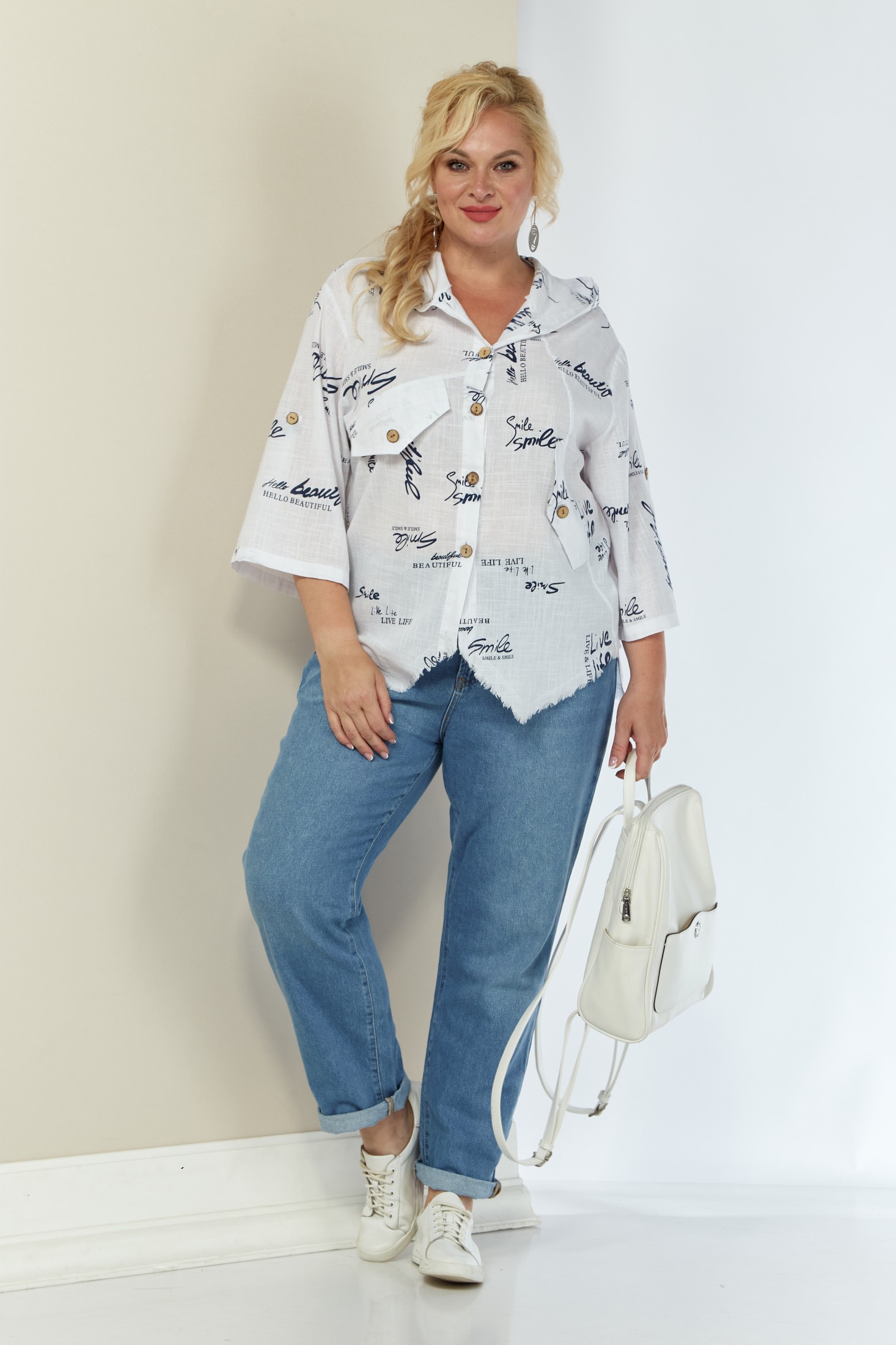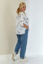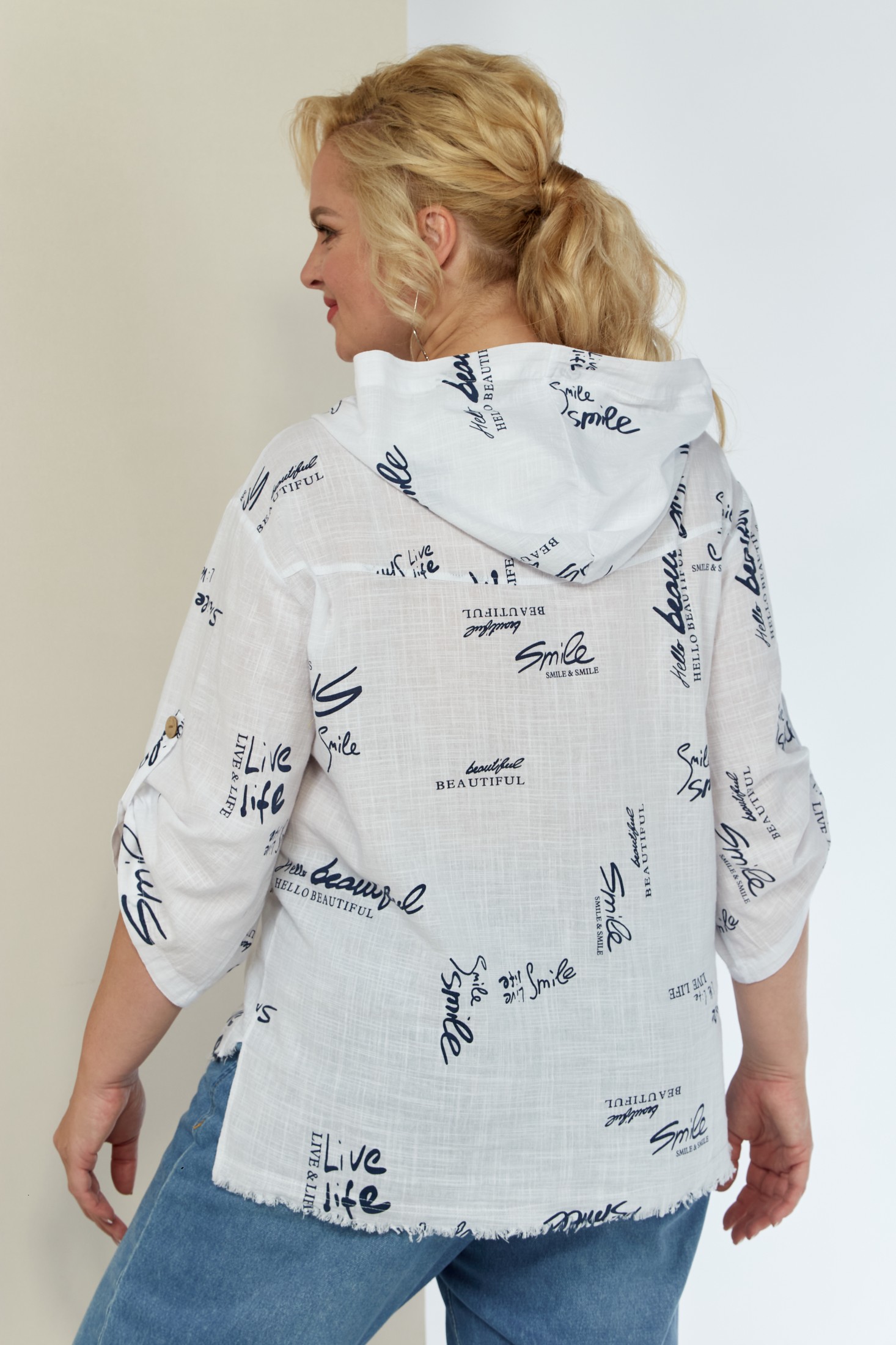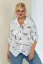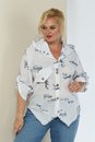 Летняя льняная рубашка с принтом. Изделие с центральной застежкой на пуговицы. Полочка с ассиметричными подрезами и декоративными клапанами. Рукав трансформер, со спущенной линией плеча, регулируется при помощи паты и пуговицы. Спинка с отрезной кокеткой. Капюшон втачной. Рубашка имеет ассиметричный низ (спинка 69 см, перед - 65 см). Изделие без подкладки. Модель прекрасно сочетается с шортами, брюкам, юбками и подойдет на любой тип фигуры.
