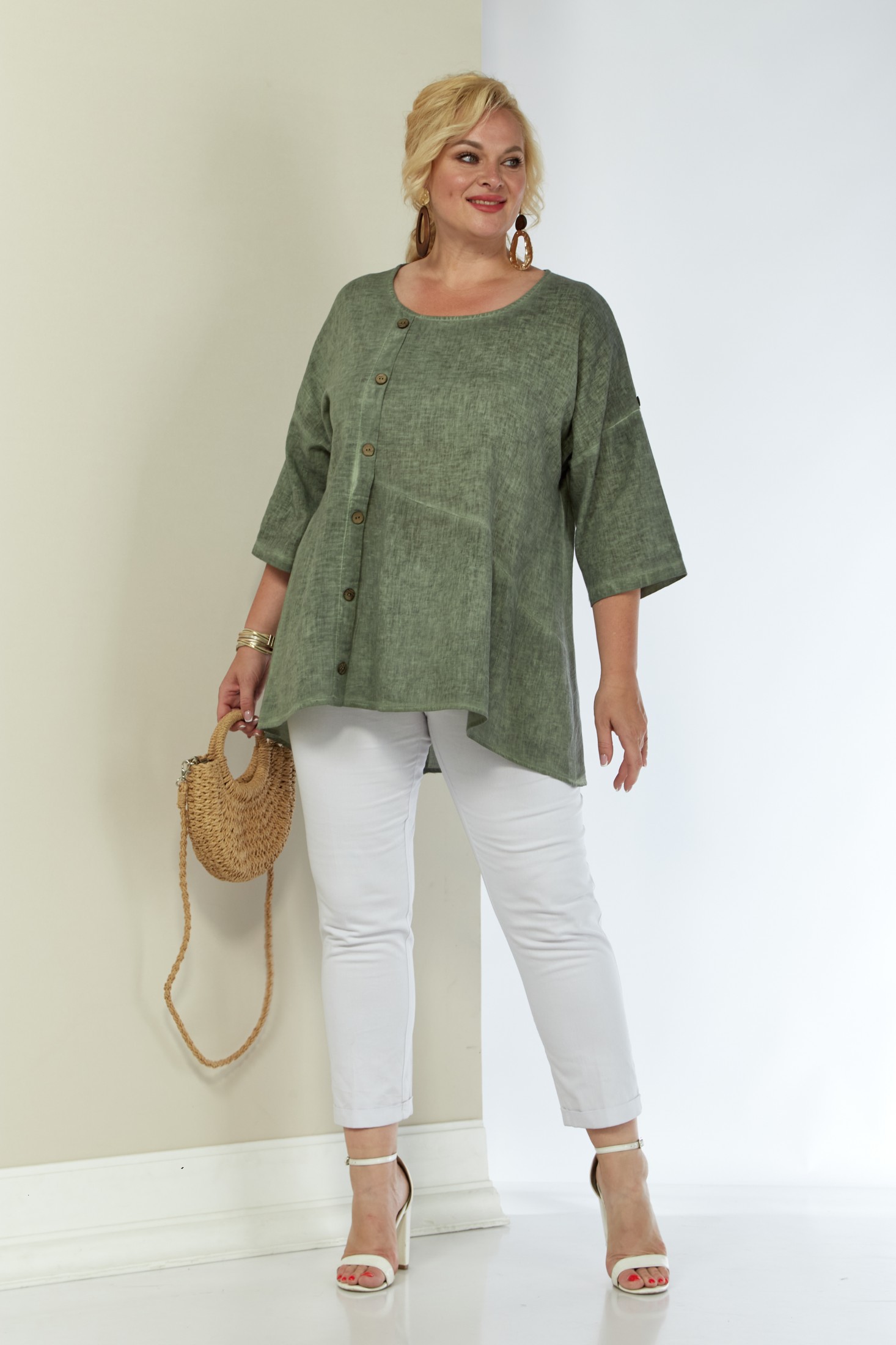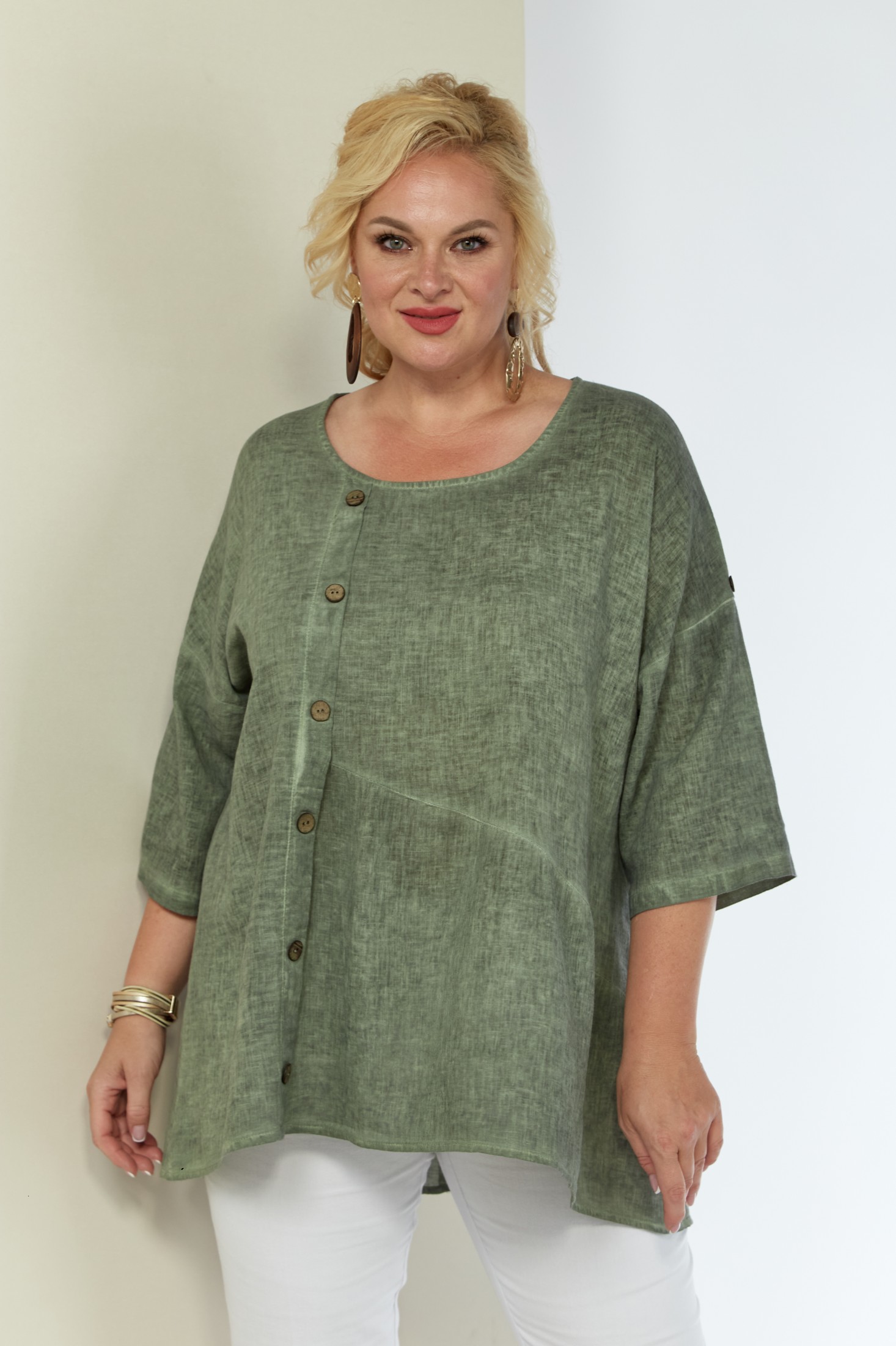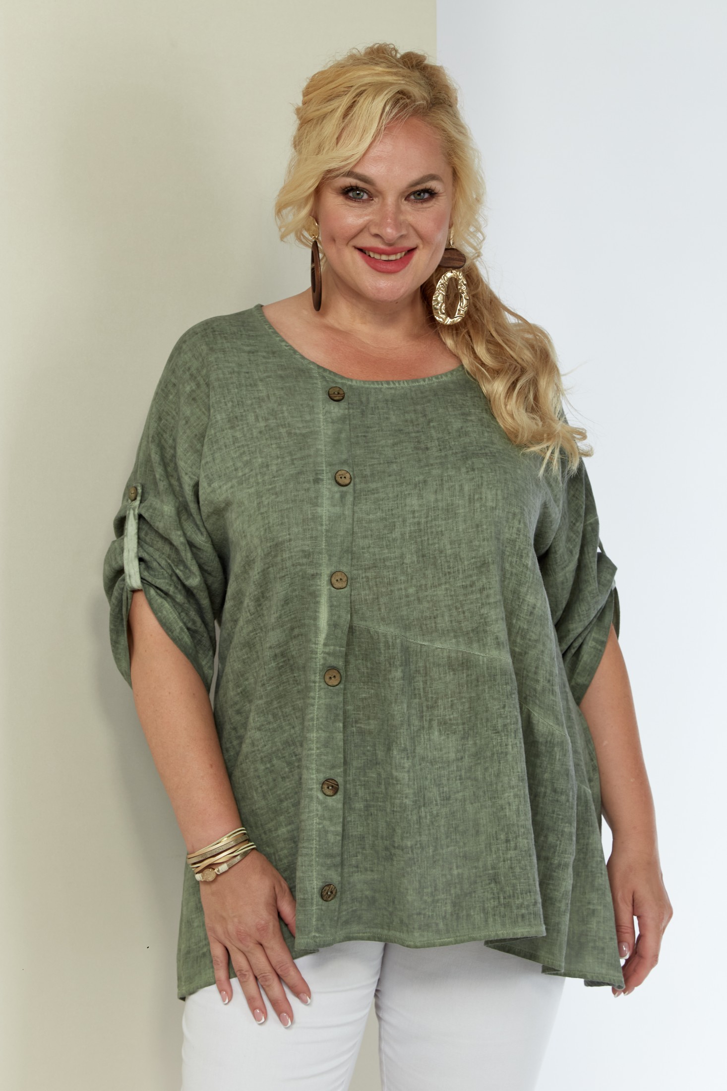Женская льняная туника выполнена из высококачественного умягченного 100% натурального льна. Лён прошёл процедуру энзимного умягчения на производстве, поэтому туника не колется и не садится после стирки. Модель свободного силуэта к низу расширена, за счет подреза и легкой сборки по полочке. Вырез горловины округлой формы. По переду смещенная планка, декорированная пуговицами. Рукав трансформер, со спущенной линией плеча, регулируется при помощи паты и пуговицы. Спинка со средним швом. Низ изделия фигурный (спинка 76 см, перед - 59 см). Длина рукава от горловины 51 см.