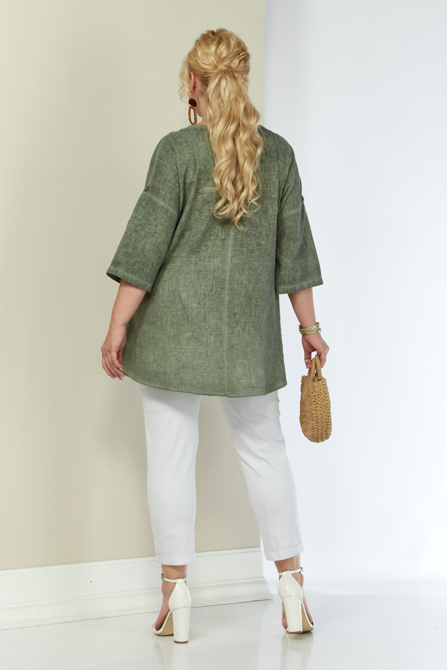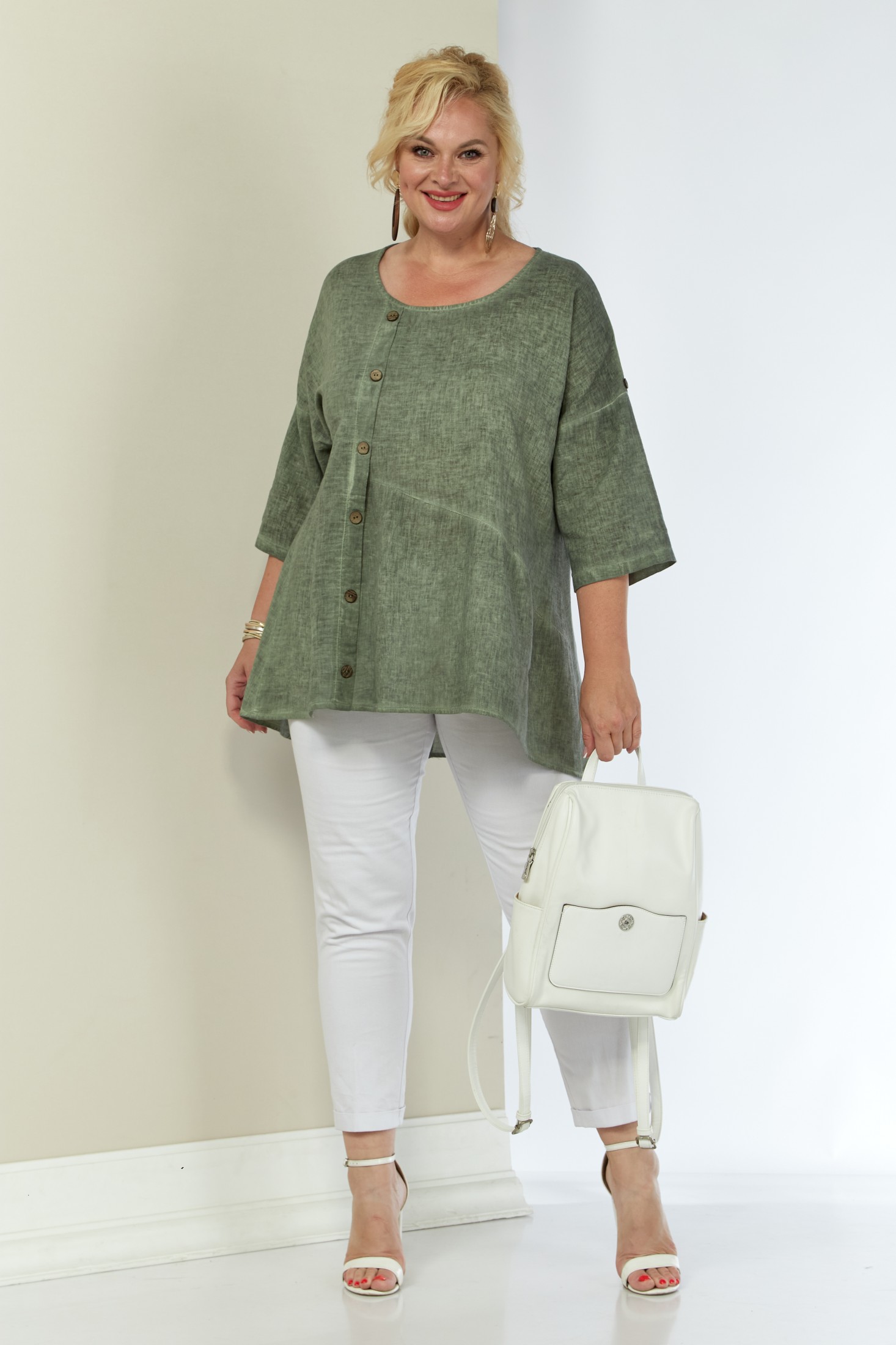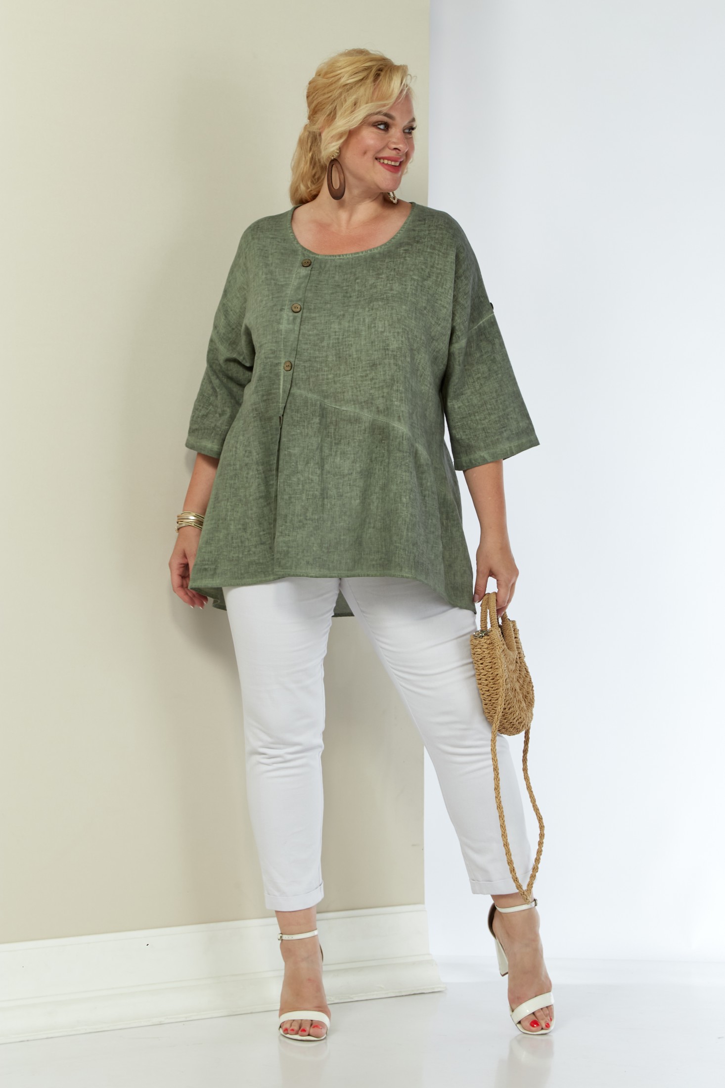 Женская льняная туника выполнена из высококачественного умягченного 100% натурального льна. Лён прошёл процедуру энзимного умягчения на производстве, поэтому туника не колется и не садится после стирки. Модель свободного силуэта к низу расширена, за счет подреза и легкой сборки по полочке. Вырез горловины округлой формы. По переду смещенная планка, декорированная пуговицами. Рукав трансформер, со спущенной линией плеча, регулируется при помощи паты и пуговицы. Спинка со средним швом. Низ изделия фигурный (спинка 76 см, перед - 59 см). Длина рукава от горловины 51 см.