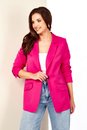 Эффектный жакет из текстильной ткани станет отличным дополнением вашего гардероба. Жакет женский удлиненный, полуприлегающего силуэта с центральной бортовой застежкой на пуговицу, на подкладке. Перед жакета с боковыми рельефными швами от проймы до низа изделия. Воротник отложной пиджачного типа. Перед с прорезными карманами и клапаном. Рукав длинный, втачной, двух шовный. По низу рукава шлица и потайная застежка-обманка на 3 пуговицы. Спинка с боковыми рельефными швами от линии проймы до линии низа и со средним швом.