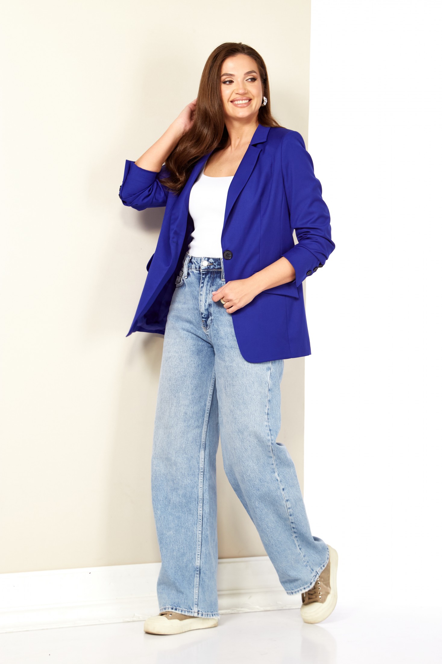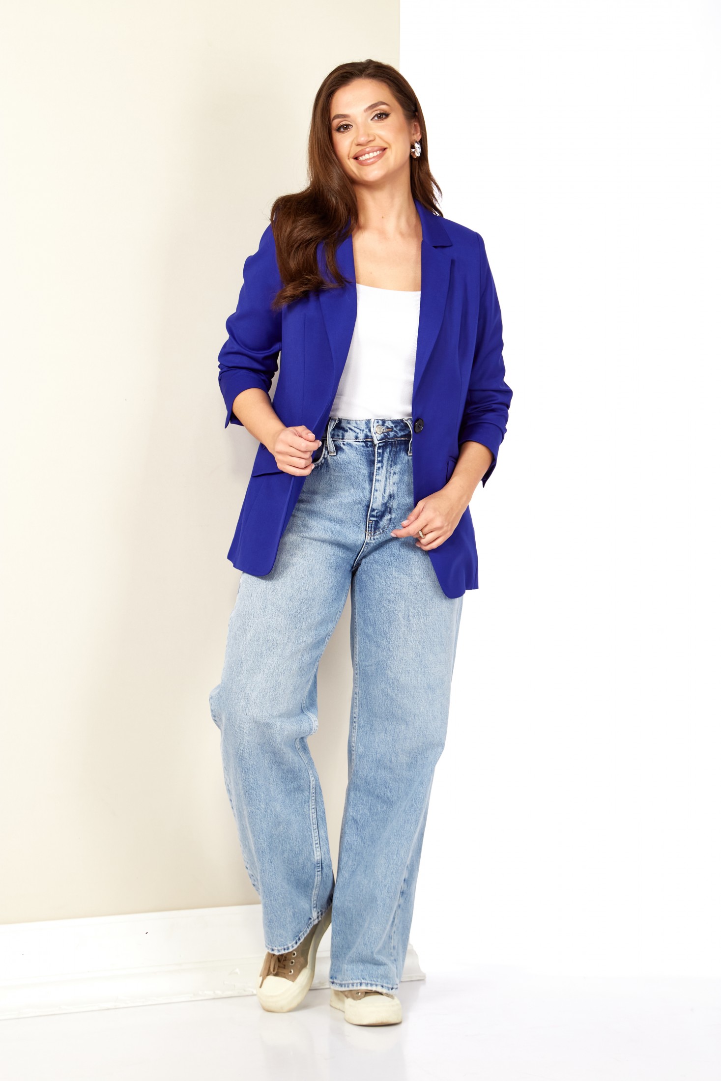 Этот жакет отлично сочетается с различными вариантами одежды, он отлично смотрится с брюками и джинсами, прямыми юбками или длинными платьями.