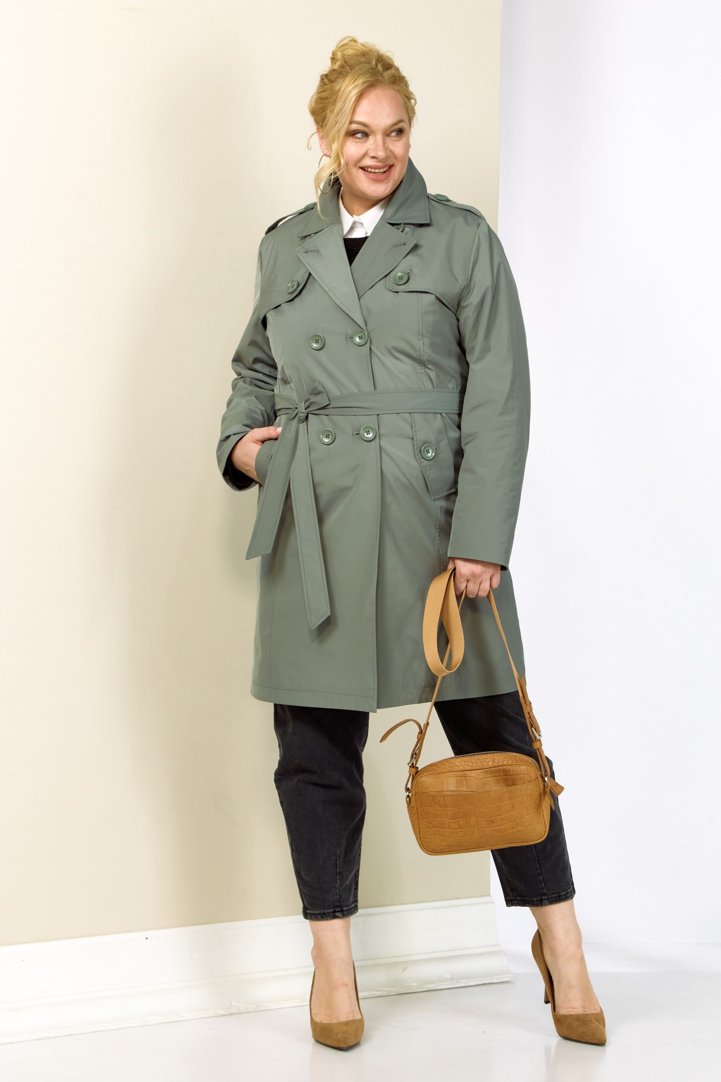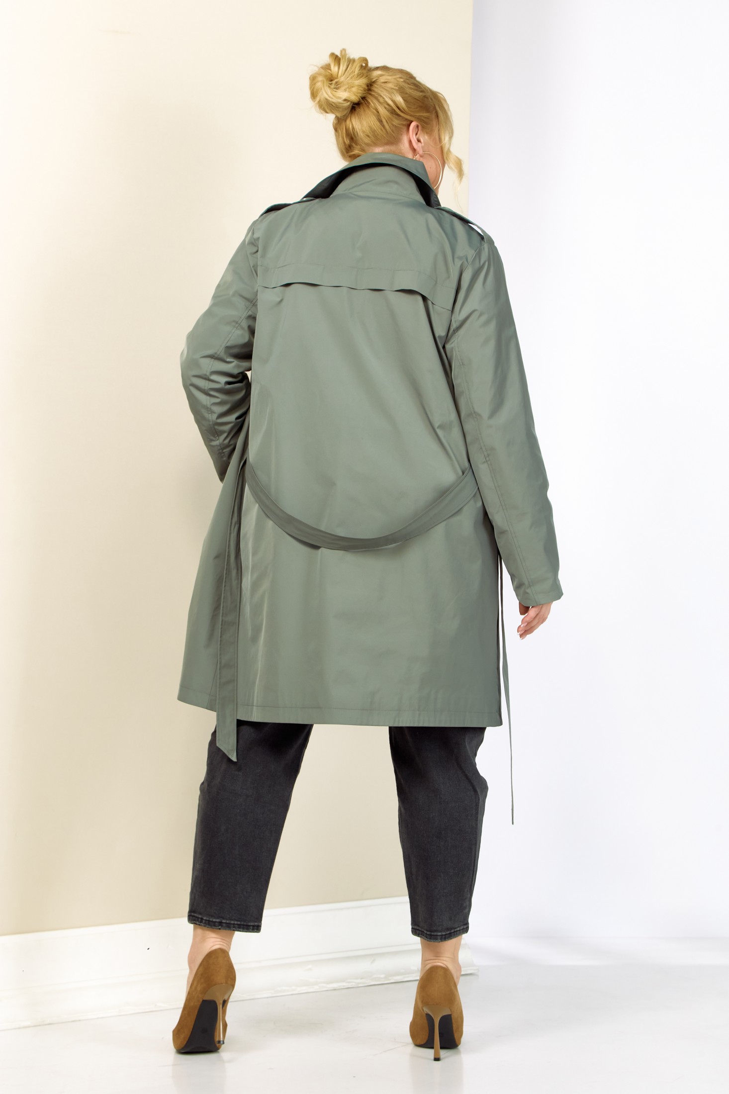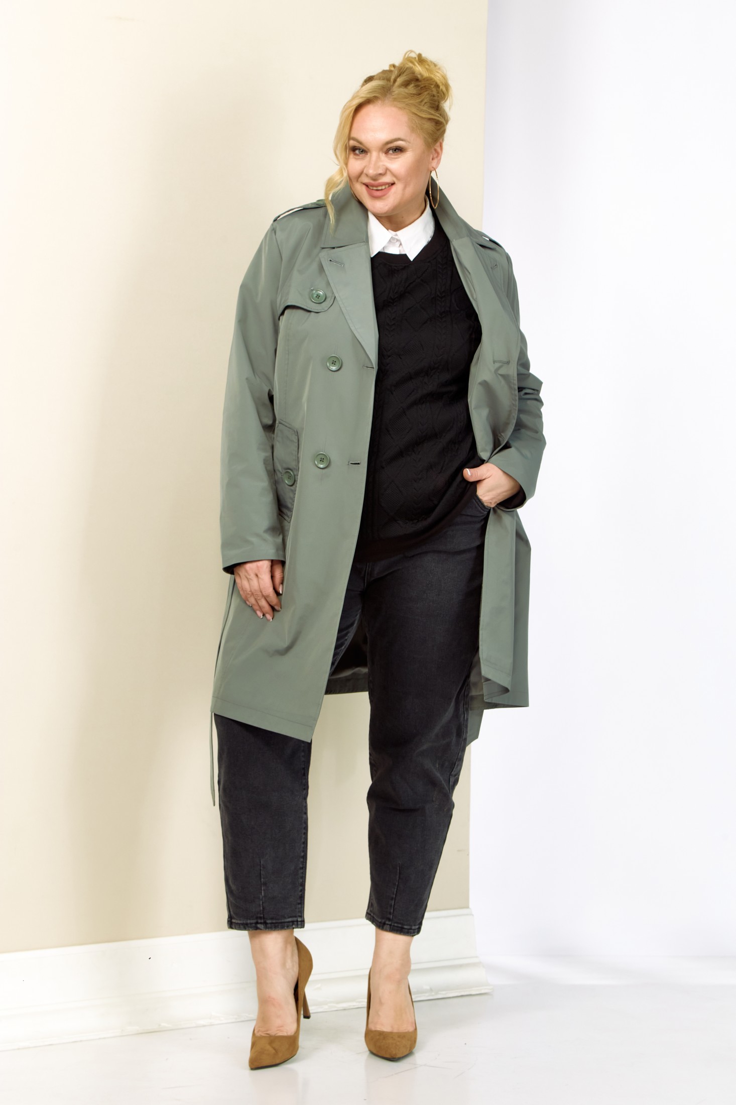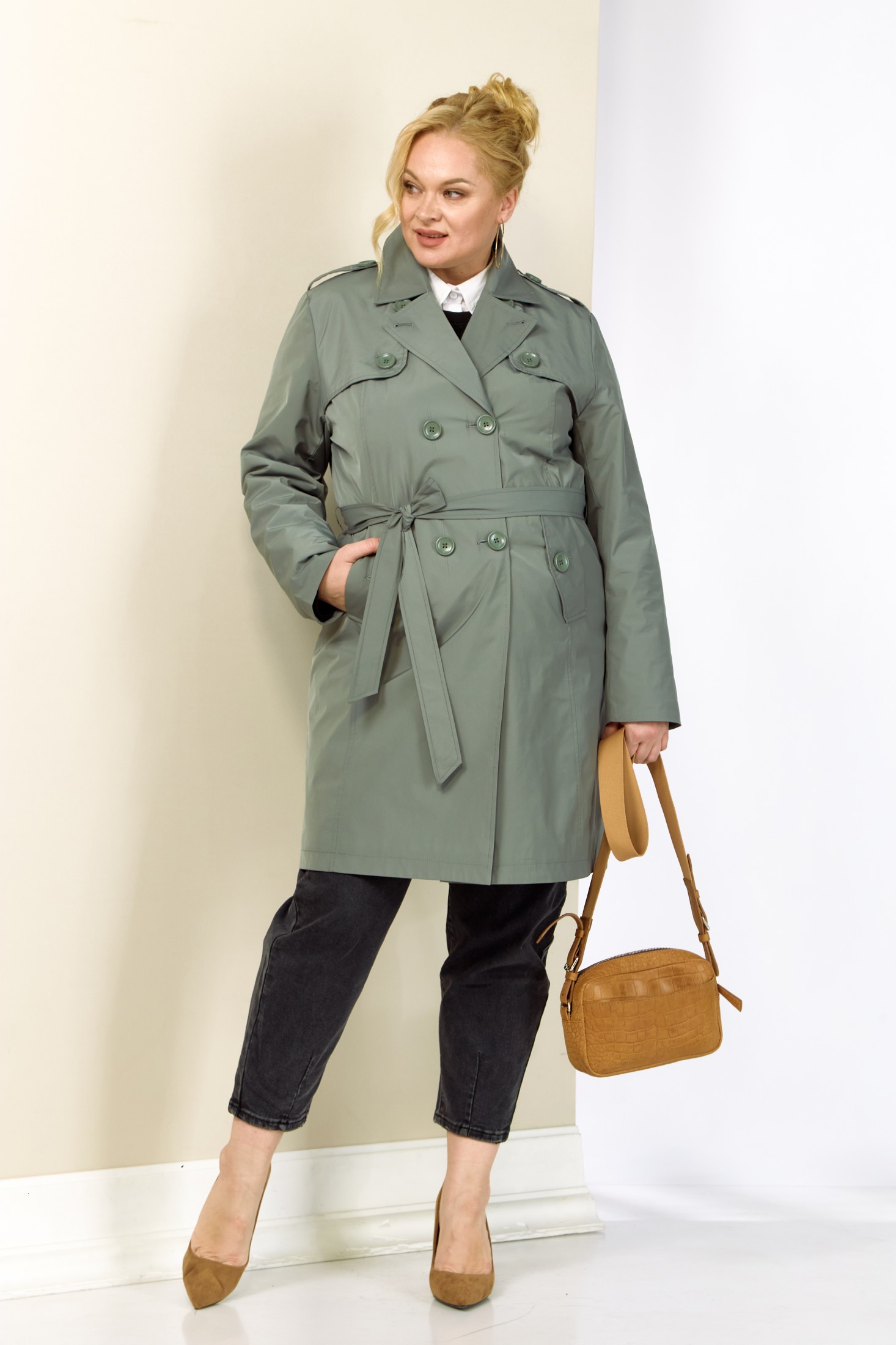 Современный, модный и стильный плащ на весенний период. Изготовлен из плащевой мягкой ткани, без утеплителя, на подкладке. Застежка двубортная. Горловина оформлена широким воротником пиджачного типа. Рукав втачной, длинный, что делает его практичным выбором для переменчивой погоды. Длина регулируется с помощью отворота. Передняя часть с отлетной кокеткой и двумя фунуциональными карманами на внутренних магнитах. Изделие прямого, классического кроя в комплекте со съемным поясом, который придает приталенный силует и элегантность. Спинка с отрезной кокеткой.