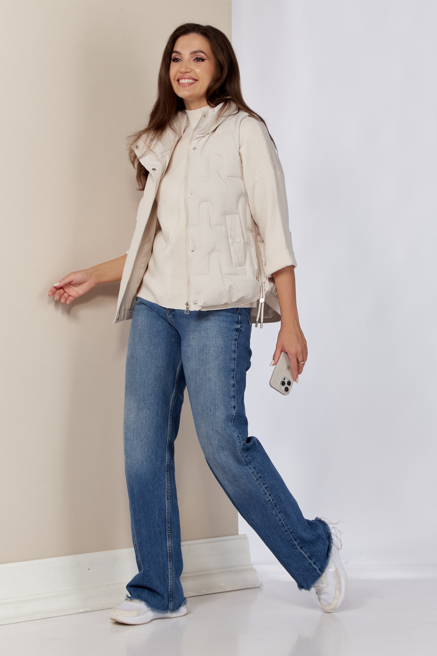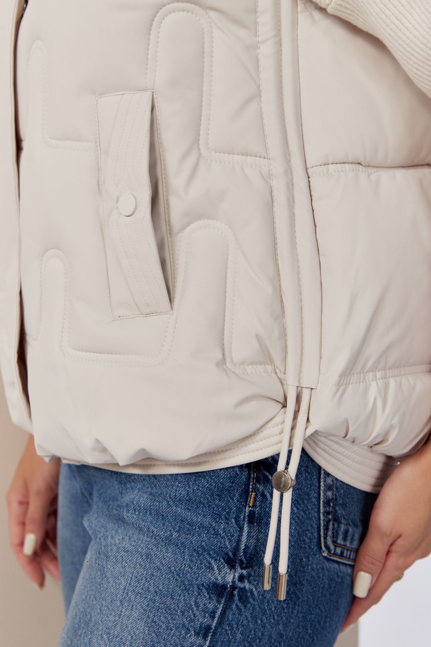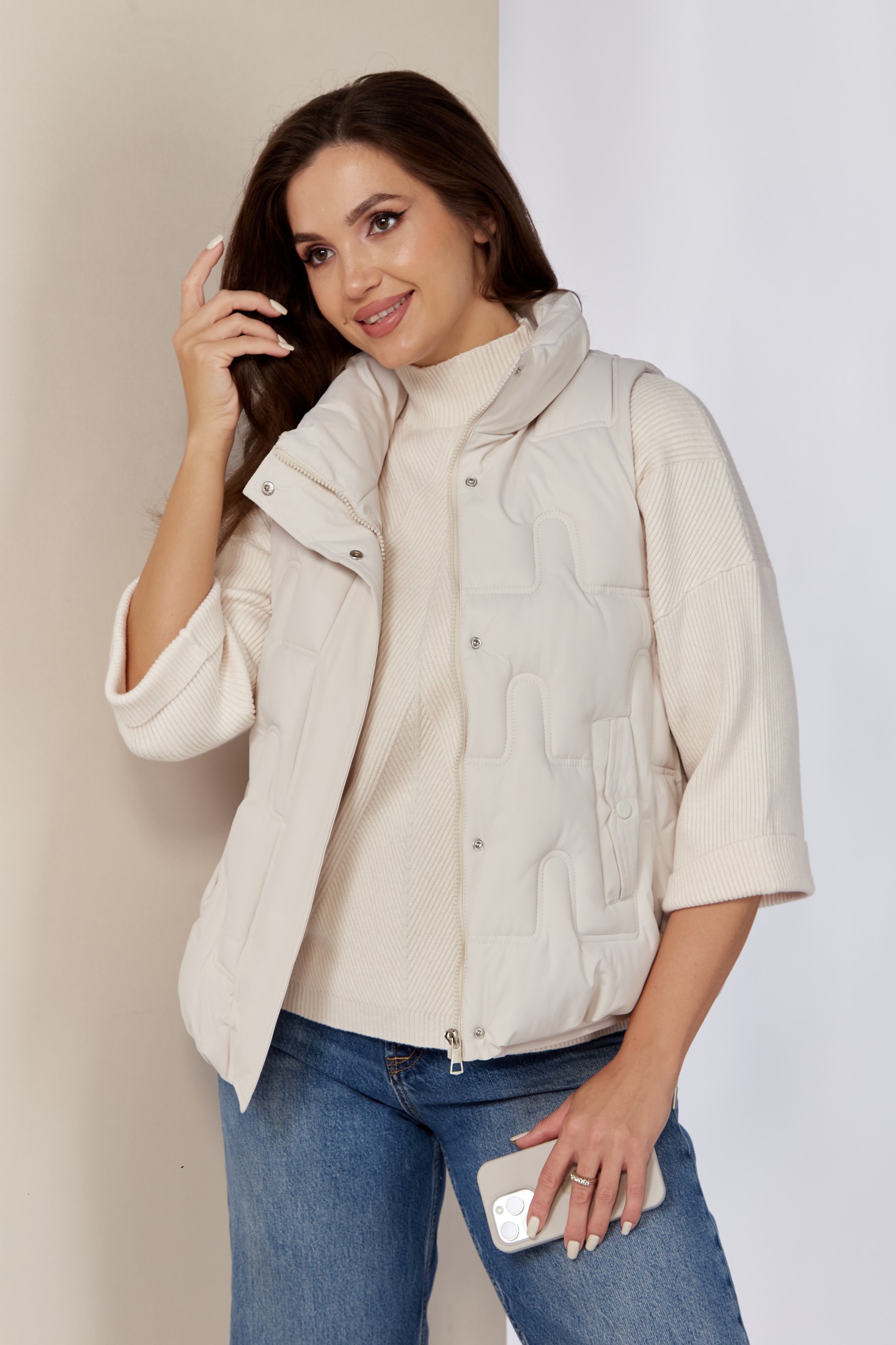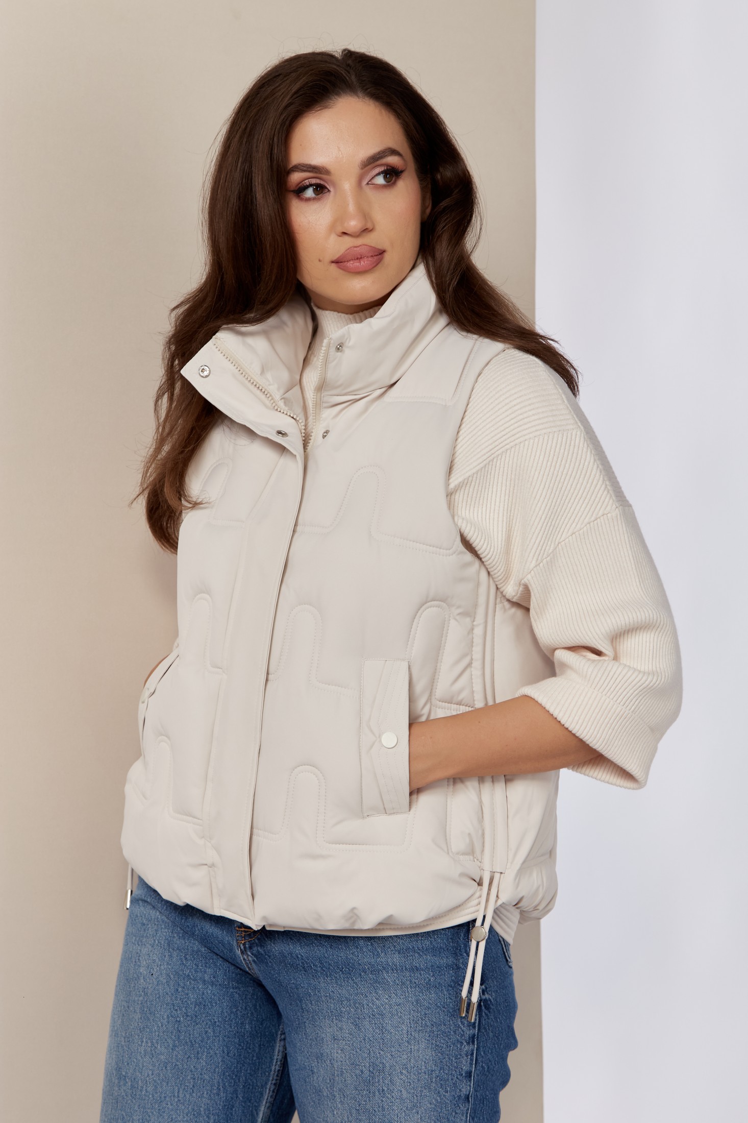 Женская утепленная жилетка - это идеальный вариант стильной и теплой женской безрукавки для демисезонного периода. Она изготовлена из качественного материала на синтепоне. Мягкий материал демисезонной жилетки имеет красивый вид, не шуршит и прост в уходе, не теряет форму после многочисленных стирок. Жилет прямого свободного силуэта. Застежка центральная на молнии с планкой на кнопки. По переду прорезные карманы с декоративной листочкой с имитацией кнопки. Боковые швы оформлены декоративным шнуром.