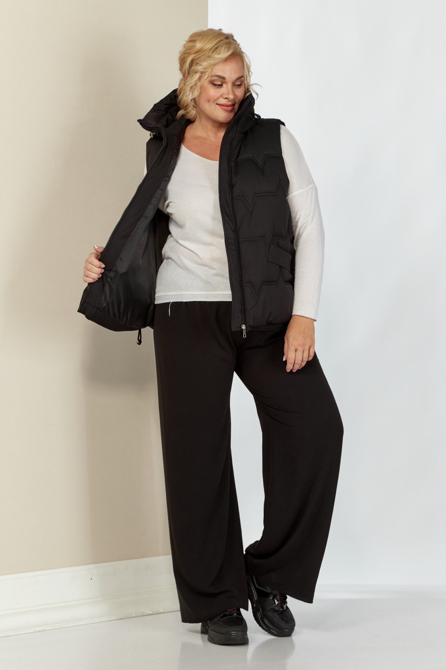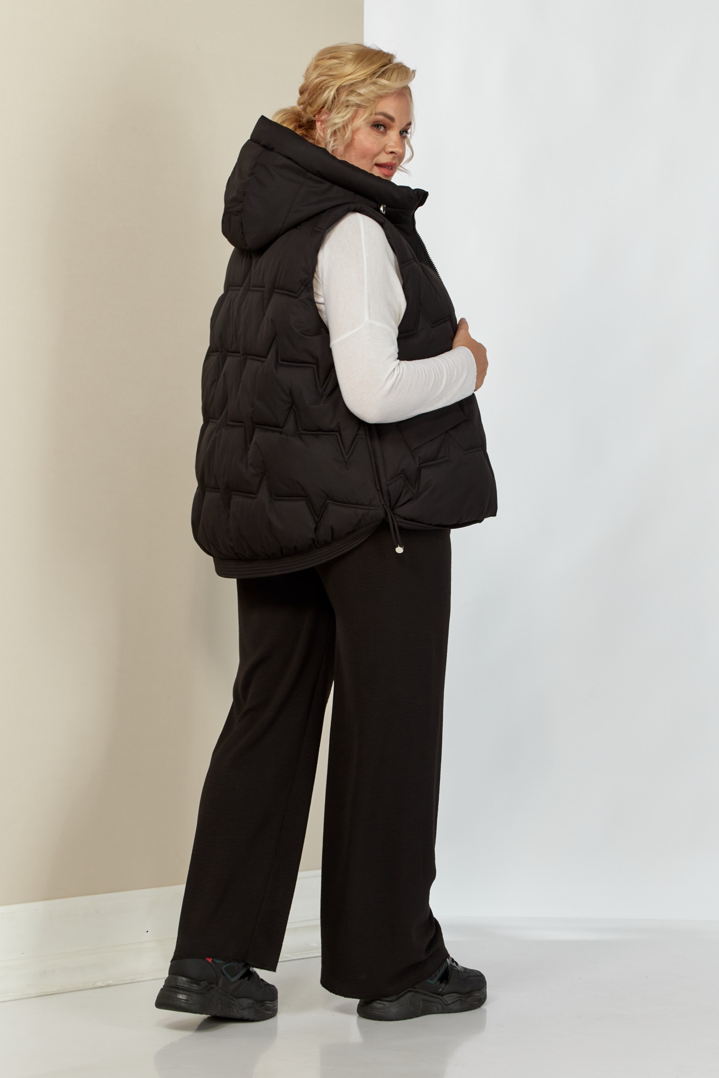 Женская утепленная жилетка с капюшоном - это идеальный вариант стильной и теплой женской безрукавки для демисезонного периода. Она изготовлена из качественного материала на синтепоне. Мягкий материал демисезонной жилетки имеет красивый вид, не шуршит и прост в уходе, не теряет форму после многочисленных стирок. Жилет прямого силуэта. Застежка центральная на молнии. По переду прорезные карманы с листочкой. Боковые швы оформлены декоративным шнуром. Капюшон не съемный.
