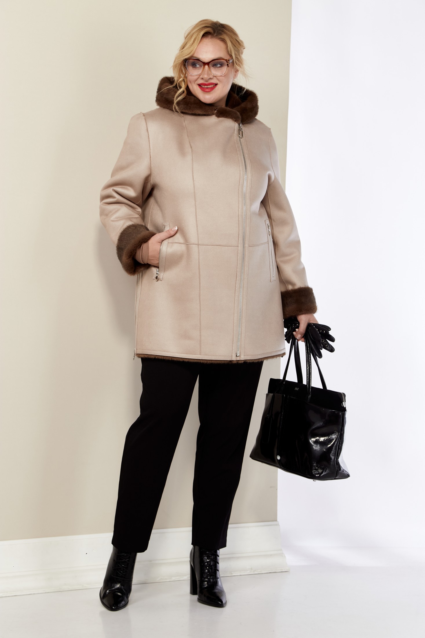 Вторая сторона изделия с прорезными карманами и со смещенной застежкой по косой с планкой на петли и пуговицы. Это отличный выбор для современной молодой девушки или утонченной женщины. Носите удлиненную модель как меховую шубу или эко-дубленку. Создавайте роскошные образы зимой или в холодный демисезонный период.