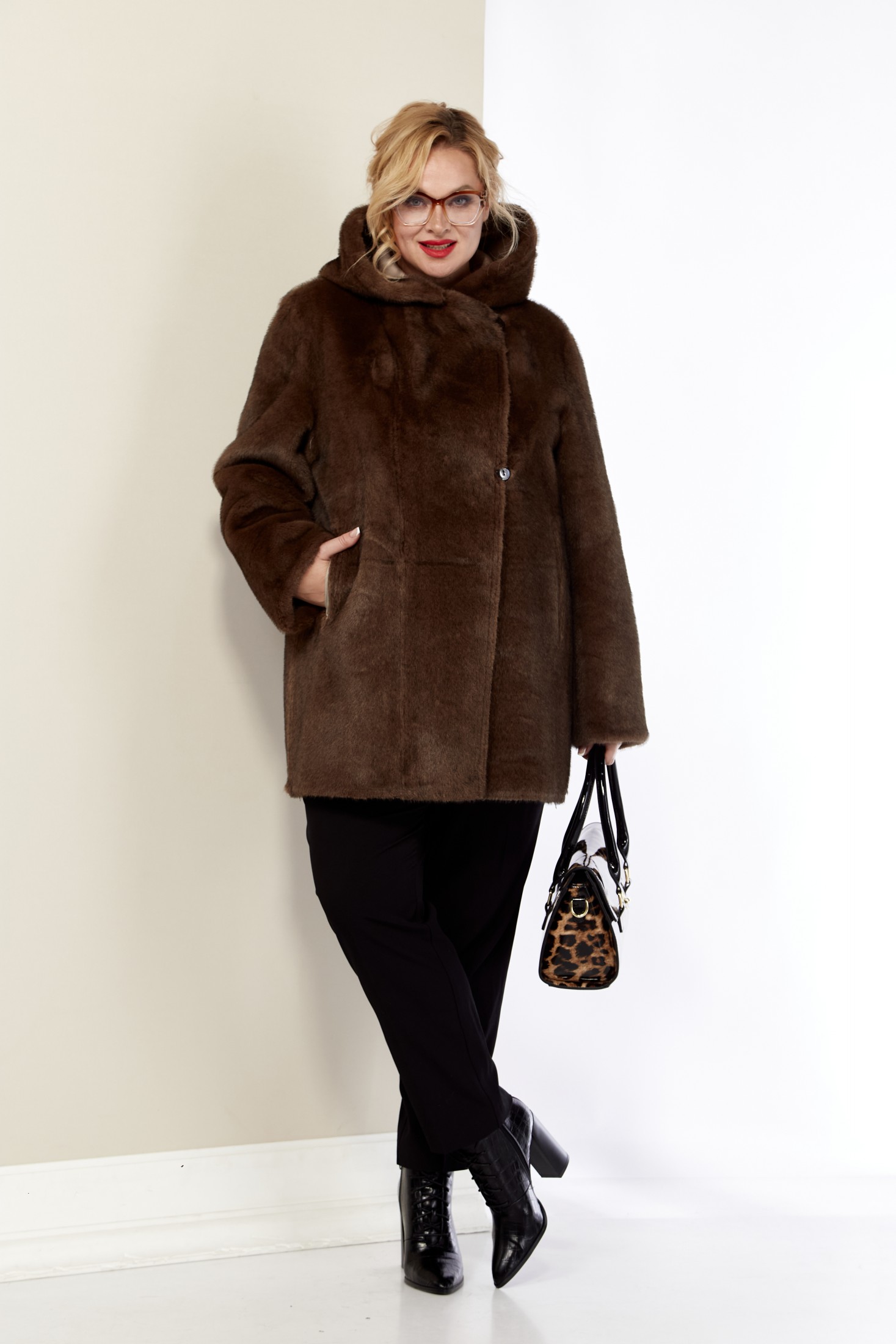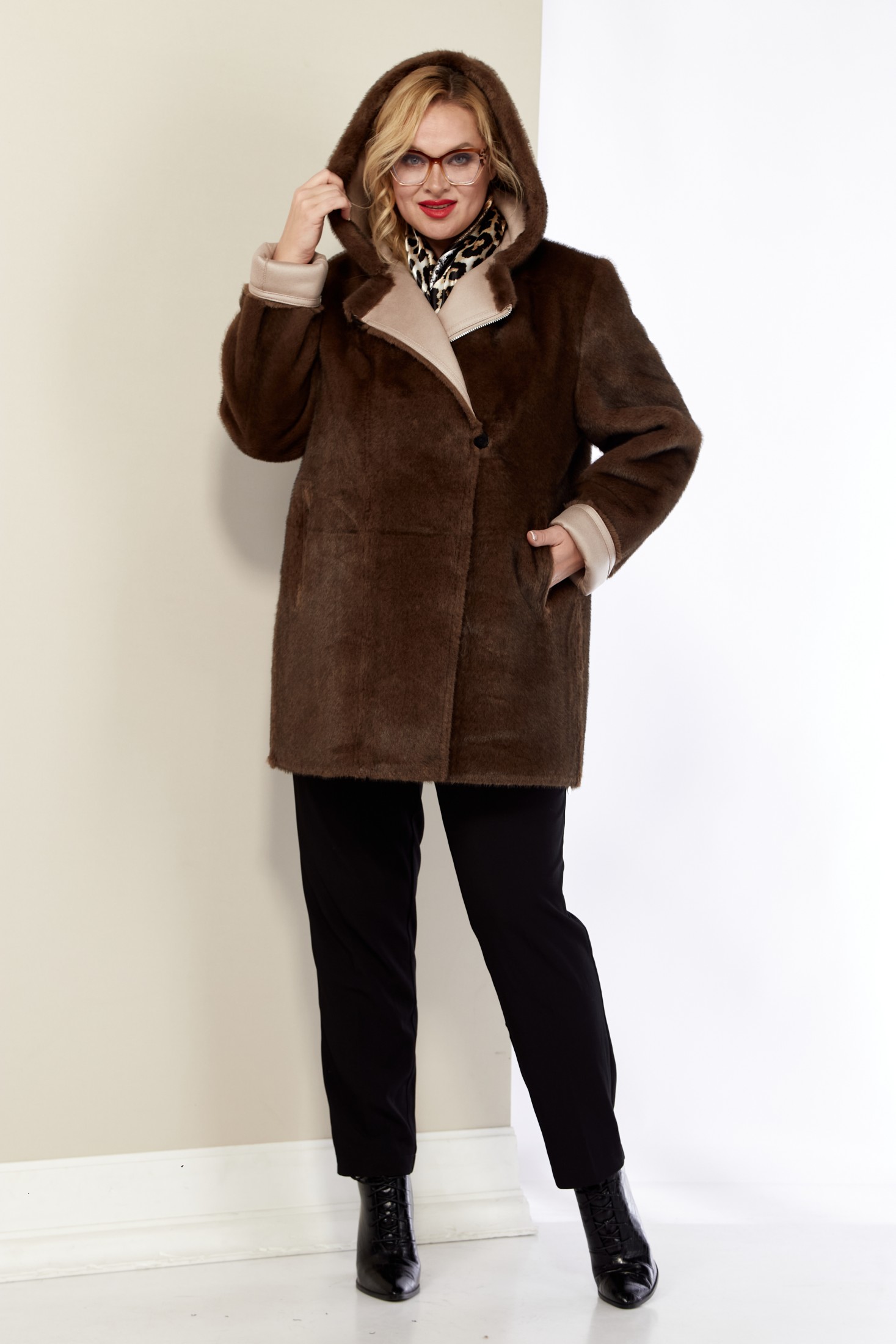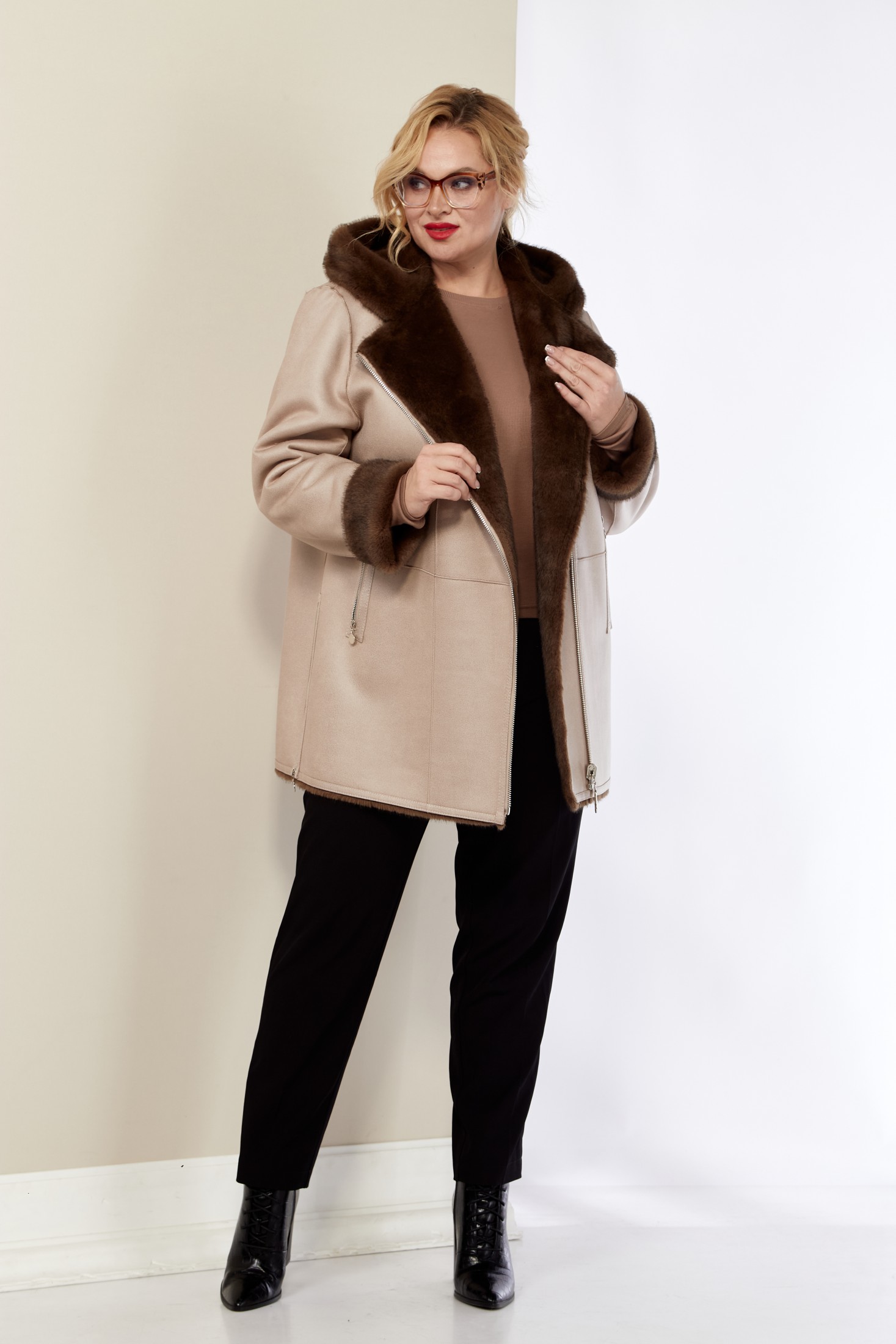 Если вы предпочитаете менять свои стиль в один день, то это изделие именно для вас, его можно носить на две стороны. Стильная модель с глубоким капюшоном и смещенной застежкой по косой. Модель из искусственной эко-кожи и эко-меха под «Норку» премиального качества. С одной стороны она норковая шубка, с другой – классическая удлиненная дубленка. По переду дубленки функциональные прорезные карманы на молнии. По низу боковых швов с обеих сторон декоративная молния (действующая). Капюшон не съемный.