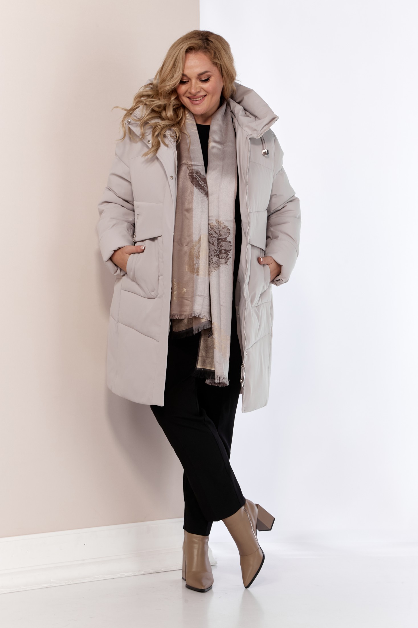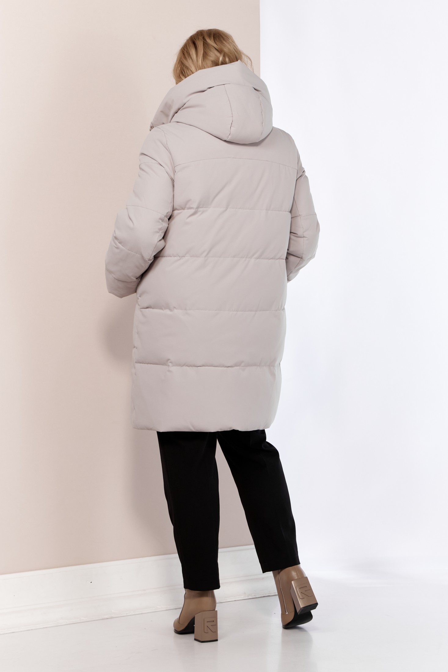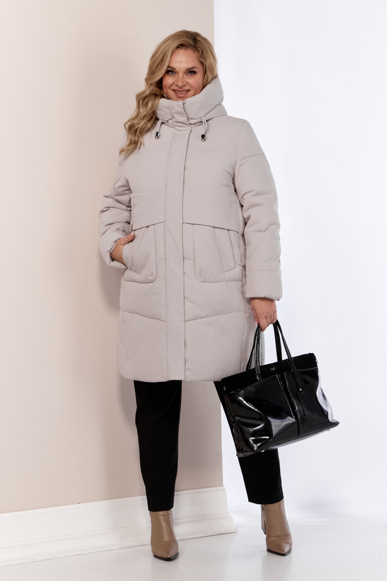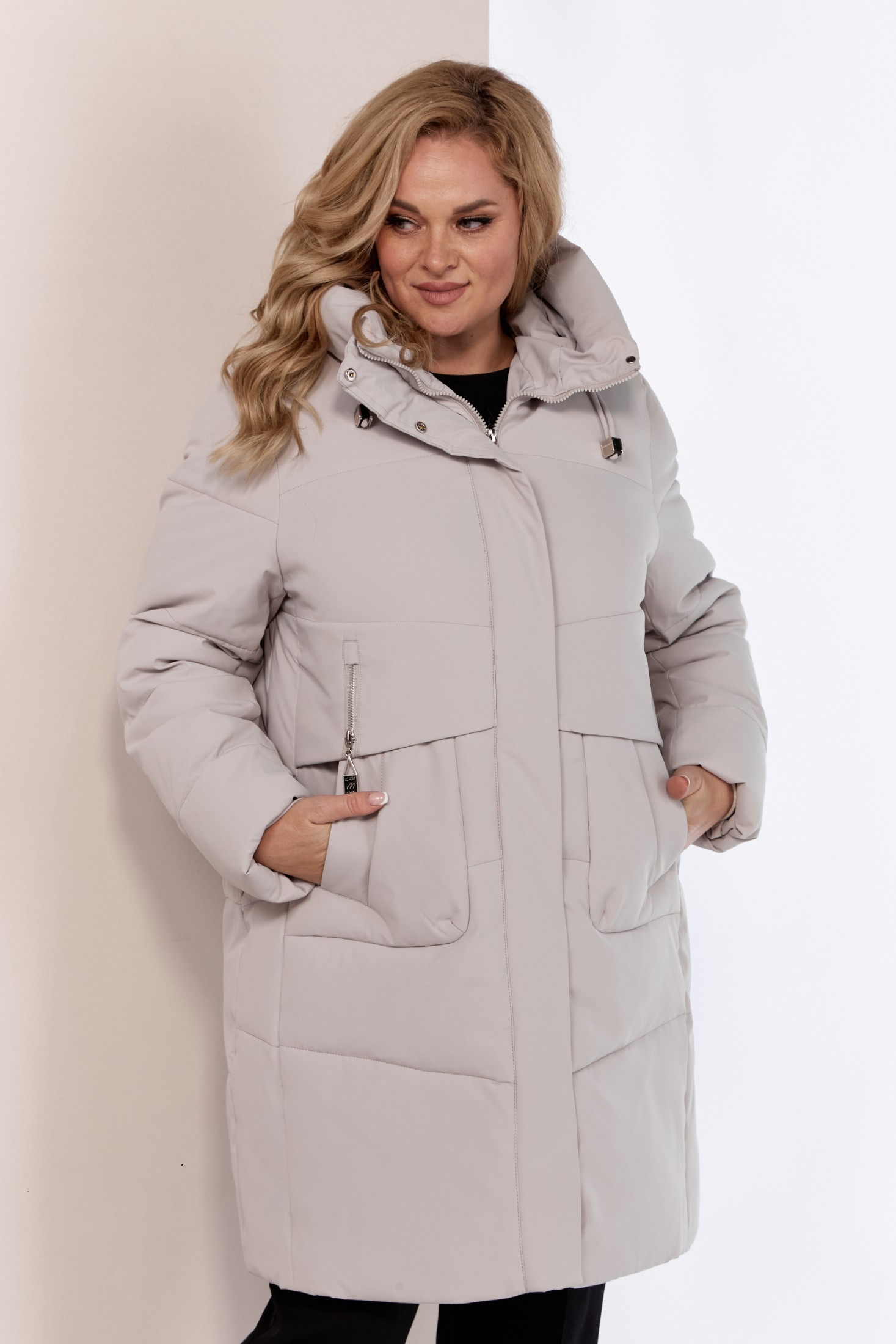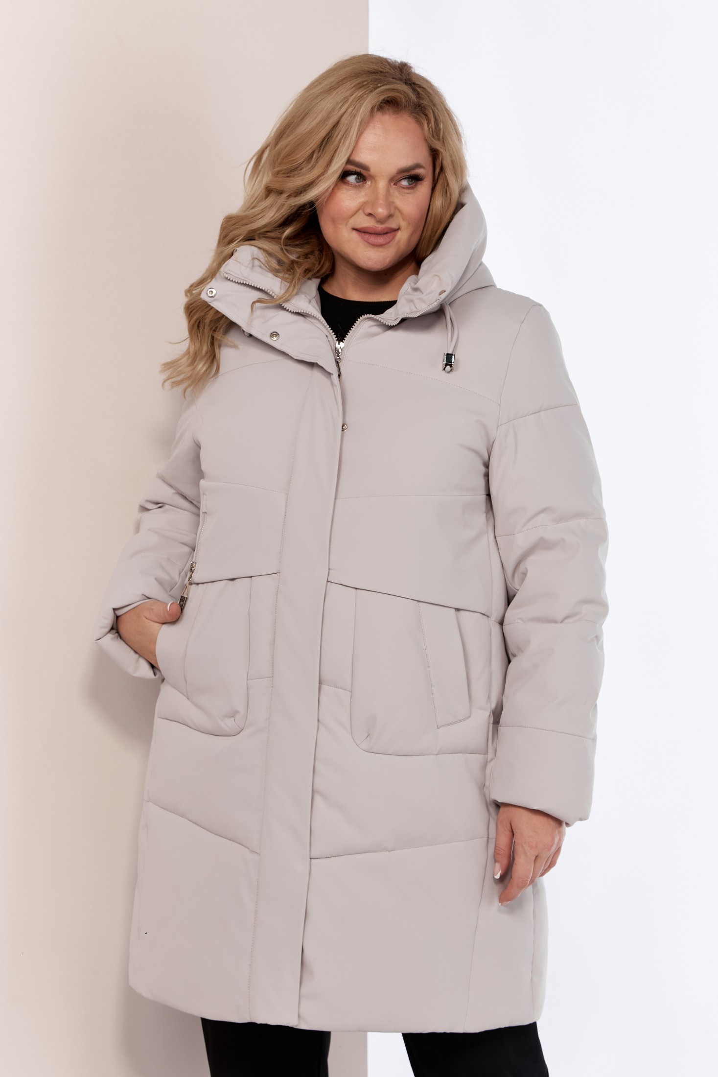 Женский зимний пуховик. Модель прямого свободного кроя в стиле куртка-пальто. Выполнена из качественного и легкого материала, который обеспечивает тепло и уют в самые холодные дни до -25 -30 градусов. Утеплитель «Холлофайбер» обеспечивает защиту от холода, что делает эту куртку идеальным выбором для зимних дней. А объемный теплый капюшон и высокий воротник защитят даже в самую ненастную погоду. Изделие на подкладке. Передняя часть куртки с декоративной подрезной кокеткой и функциональными карманами на кнопках. Застежка центральная с планкой на потайные металлические кнопки и тесьму-молнию. Капюшон не съемный, регулируется декоративным шнуром. Рукав втачной двух шовный. Для защиты от ветра и мороза, рукава по низу дополнены внутренними трикотажными манжетами. С внутренней стороны куртки имеется внутренний карман.