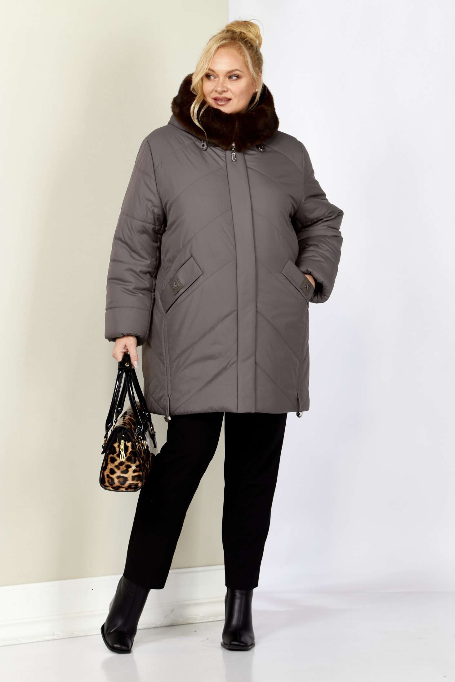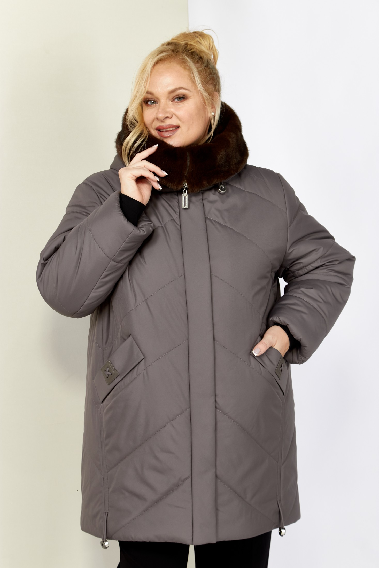 Зимняя, модная женская куртка, которая идеально подойдет для холодных дней, обеспечивая комфорт и защиту от ветра. Изделие прямого, классического стиля, выполнена из курточной матовой ткани высокого качества, непромокаемая. Утеплитель «Верблюжья шерсть» хорошо держит форму и не сбивается. По переду центральная застежка на молнии с планкой на металлические кнопки. Карманы прорезного типа на магнитах и декоративным элементом. Рукав втачной. Для защиты от ветра и мороза, рукава по низу дополнены внутренними трикотажными манжетами. Капюшон не съемный, регулируется декоративным шнуром. Внутренняя часть капюшона отделана мехом, максимально по внешнему виду приближенного к натуральному «Норка». Боковые швы оформлены декоративным шнуром. Спинка цельная. Низ изделия на регулируемой кулисе, что позволит сохранить тепло в холодное время года.
