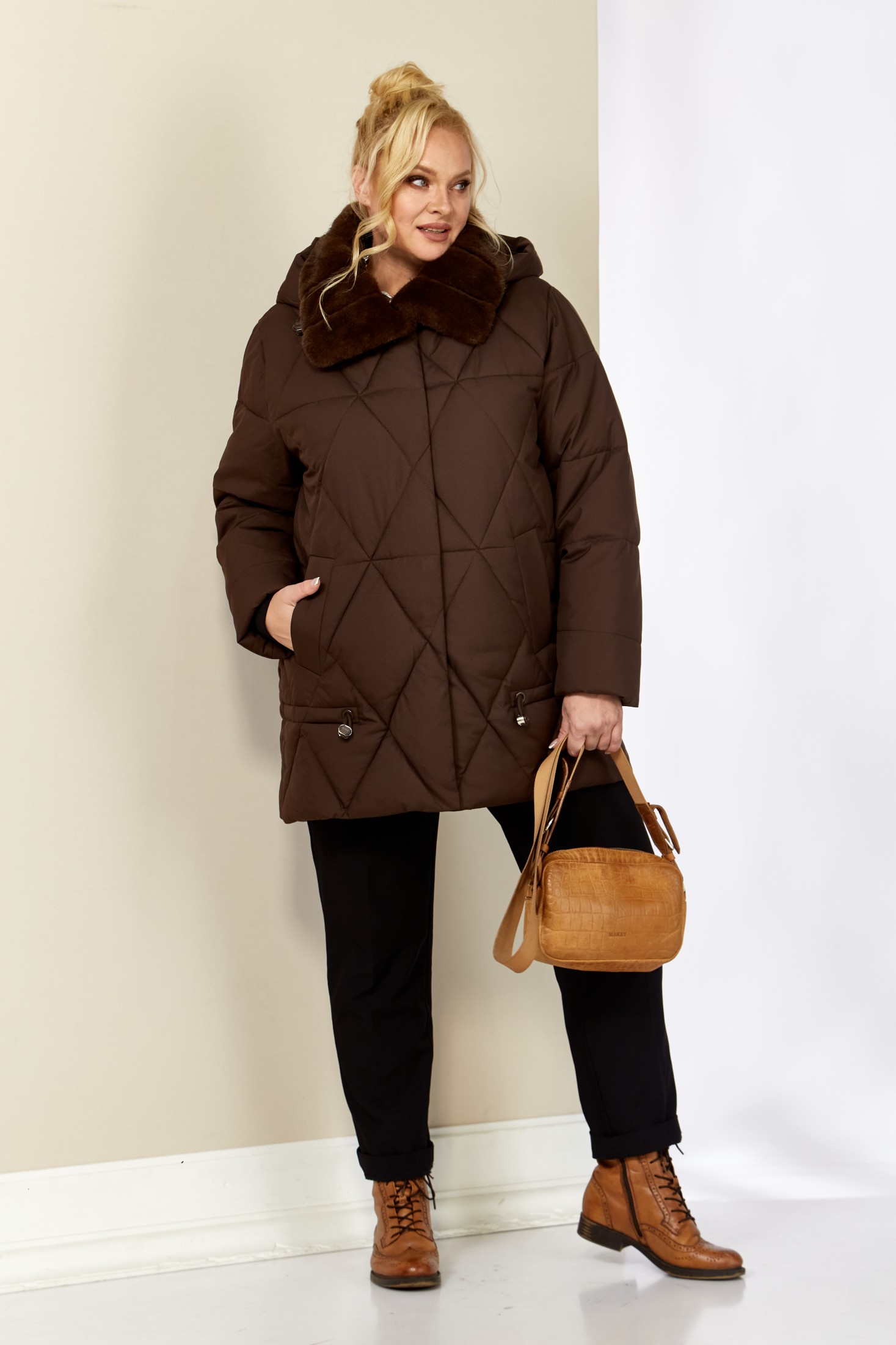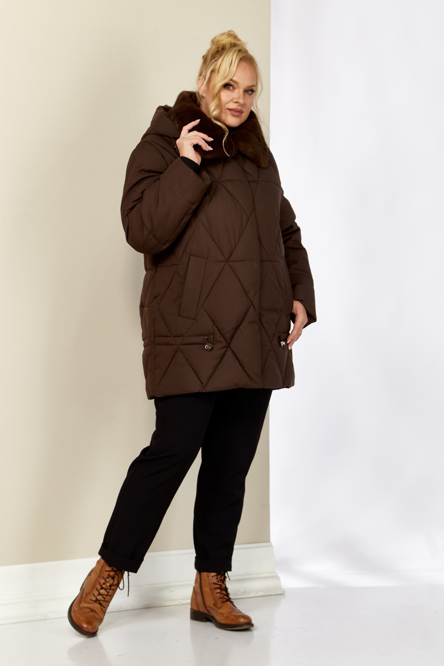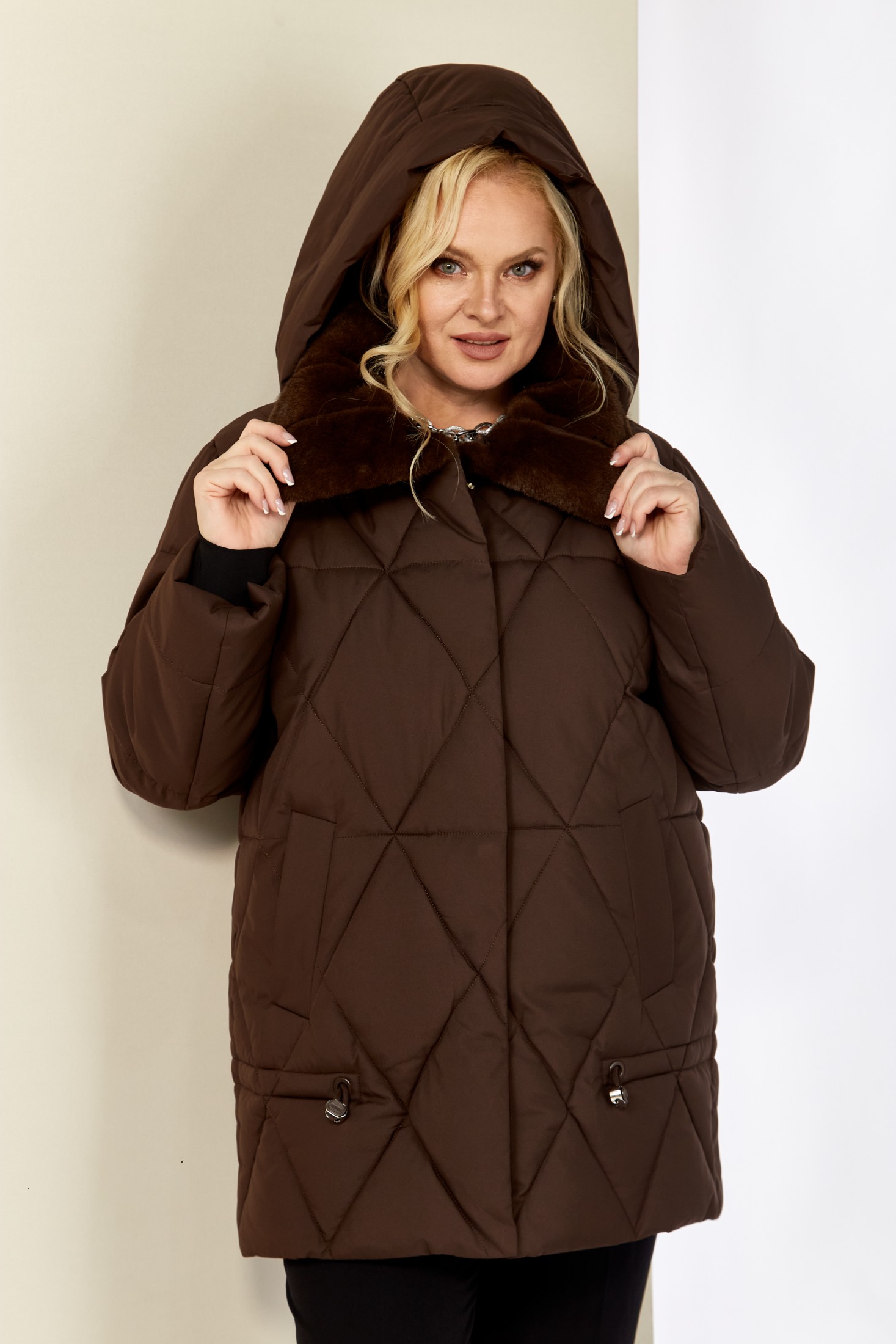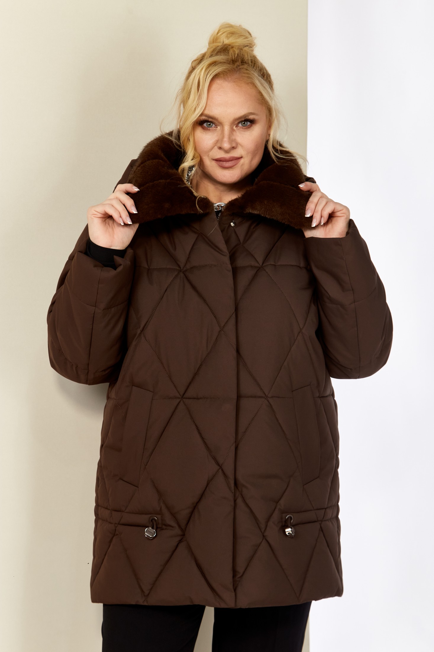 Зимняя, модная женская куртка, которая идеально подойдет для холодных дней, обеспечивая комфорт и защиту от ветра. Изделие прямого, классического стиля, выполнена из курточной матовой ткани высокого качества, непромокаемая. Утеплитель «Холлофайбер» хорошо держит форму и не сбивается. По переду центральная застежка на молнии и металлические кнопки. Карманы прорезного типа на магнитах. Нижняя часть изделия регулируется декоративным шнуром. Рукав втачной. Для защиты от ветра и мороза, рукава по низу дополнены внутренними трикотажными манжетами. Воротник отделан мехом, максимально по внешнему виду приближенный к натуральному «Норка». Капюшон съемный, регулируется декоративным шнуром. Спинка цельная.