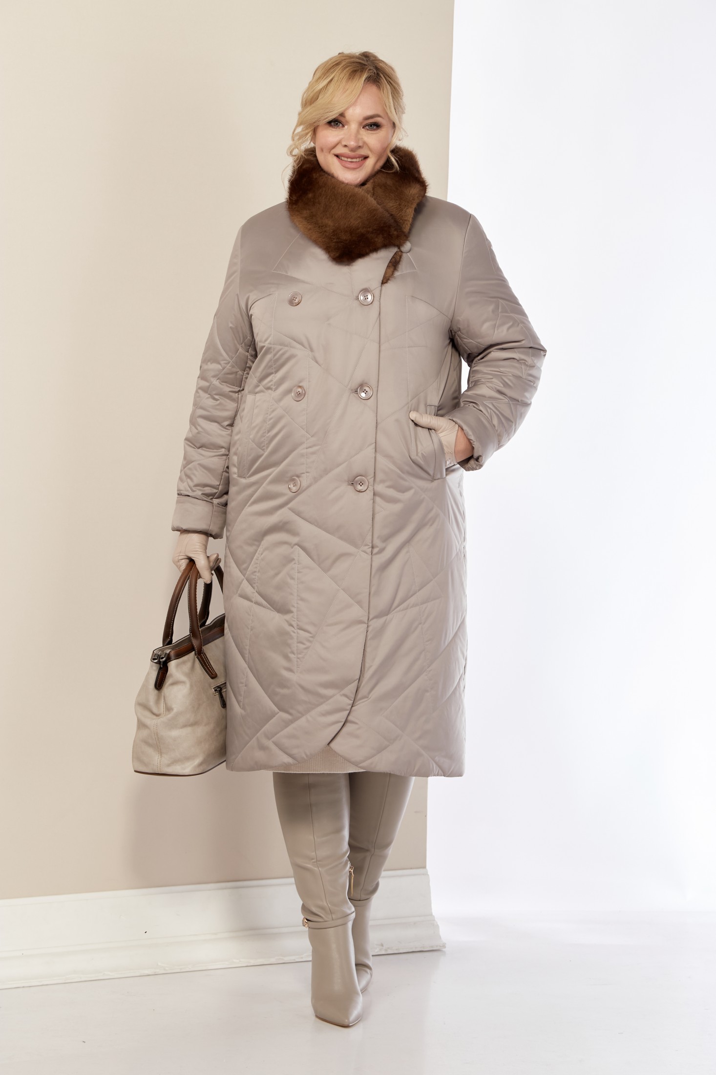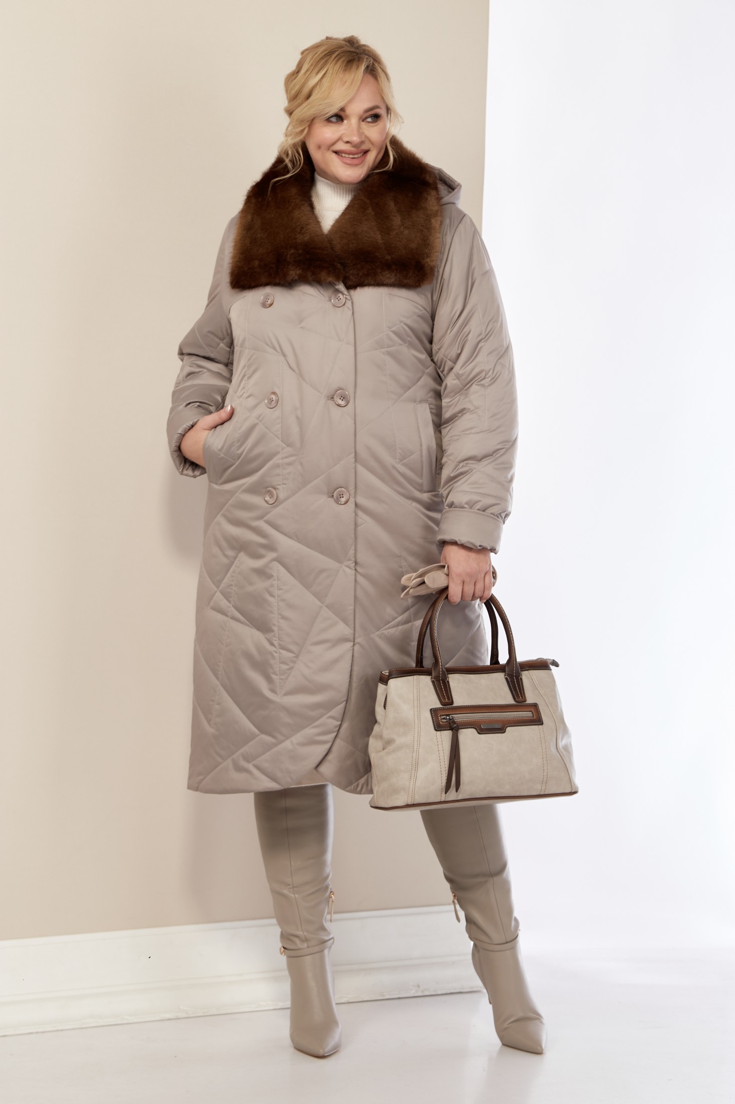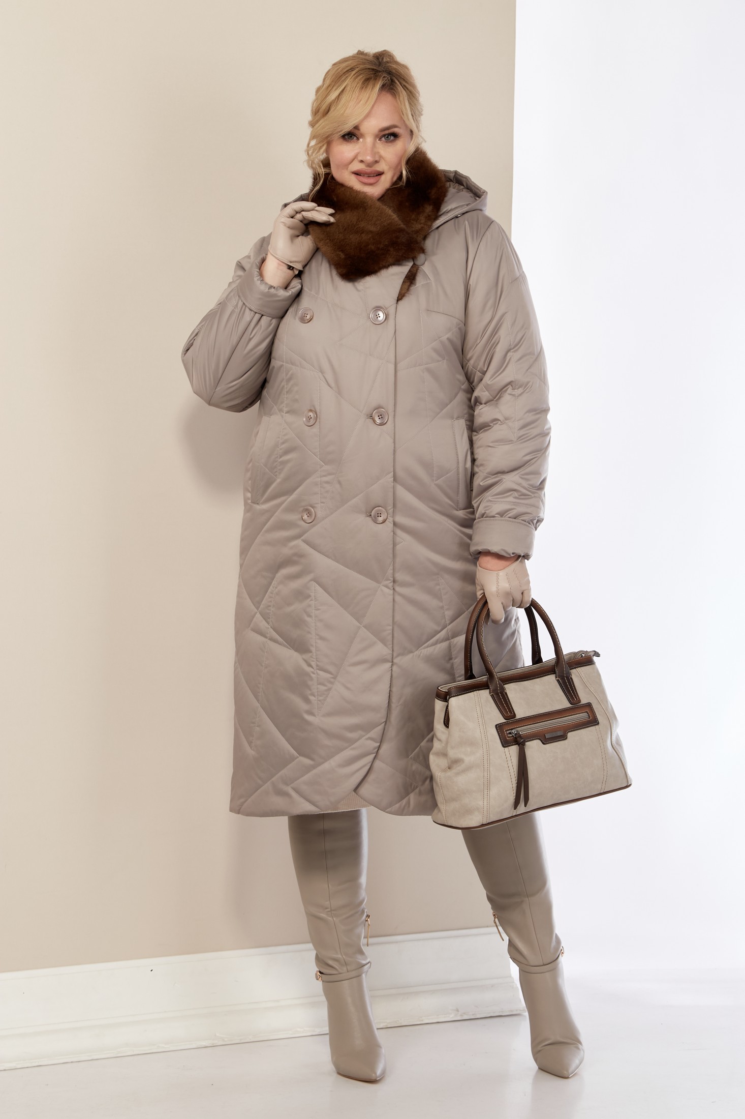 Стильное и модное женское пальто, которое идеально подходит для холодных дней, обеспечивая комфорт и защиту от ветра. Изделие прямого, классического стиля. Выполнено из стеганого мягкого материала, что делает пальто особо уютным и приятным на ощупь. Утеплитель «Верблюжья шерсть» хорошо держит форму и не сбивается. По переду центральная застежка на молнии и пуговицы, с имитацией двубортной застежки, а в нижней части на потайные металлические кнопки. Карманы прорезного типа на молнии. Воротник украшен эко-мехом «Норка» премиум качества (не съемный). Рукав втачной. Капюшон съемный.